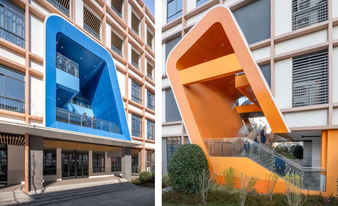 校园主街一侧的教学区由两座“E”形教学组团组成,建筑山墙面形成具有“厚度”的端头空间,在其中巧妙置入直跑楼梯、双跑楼梯,连接休息平台与缓冲空间,同时在顶层形成开放露台,在底层打造架空入口。通过虚实对比、色彩运用与形态变化,强化端头空间的可识别性,使其成为街道界面的重要标志。