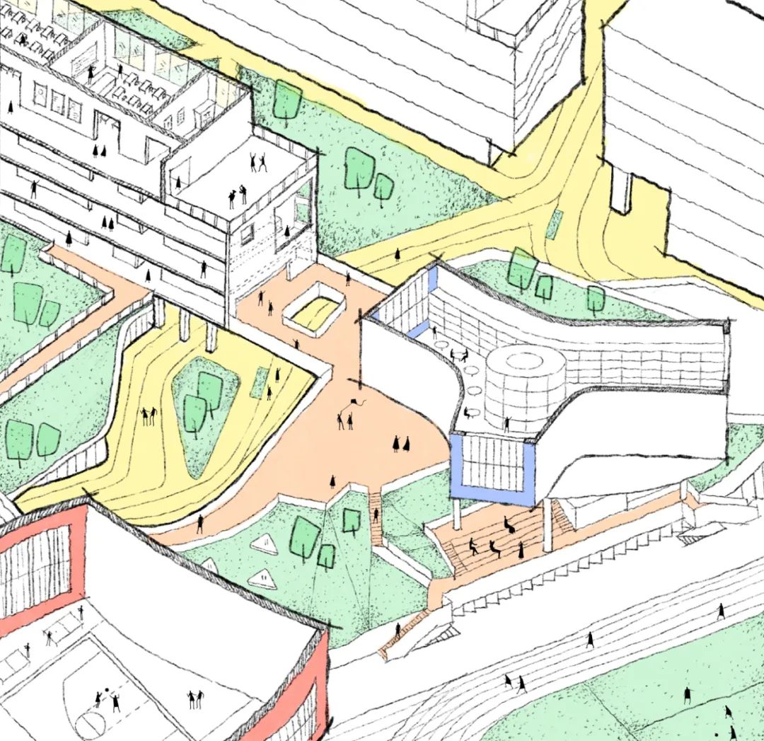 Extending from west to east, a series of secondary paths connect various spatial elements—semi-enclosed courtyards, sunken gardens, and elevated walkways—leading toward the campus’s cultural and athletic center. These routes not only guide circulation, but also create layered intersections at varying scales throughout the journey.