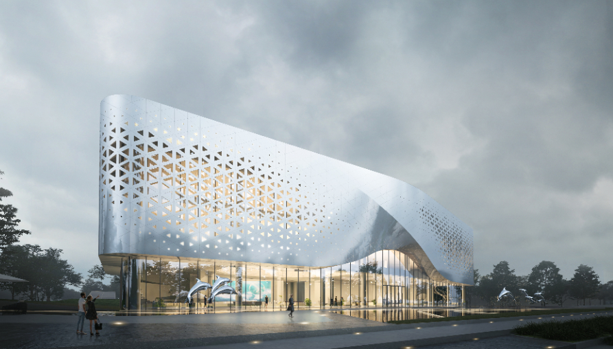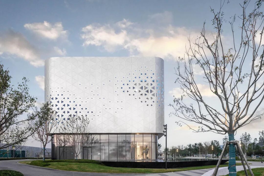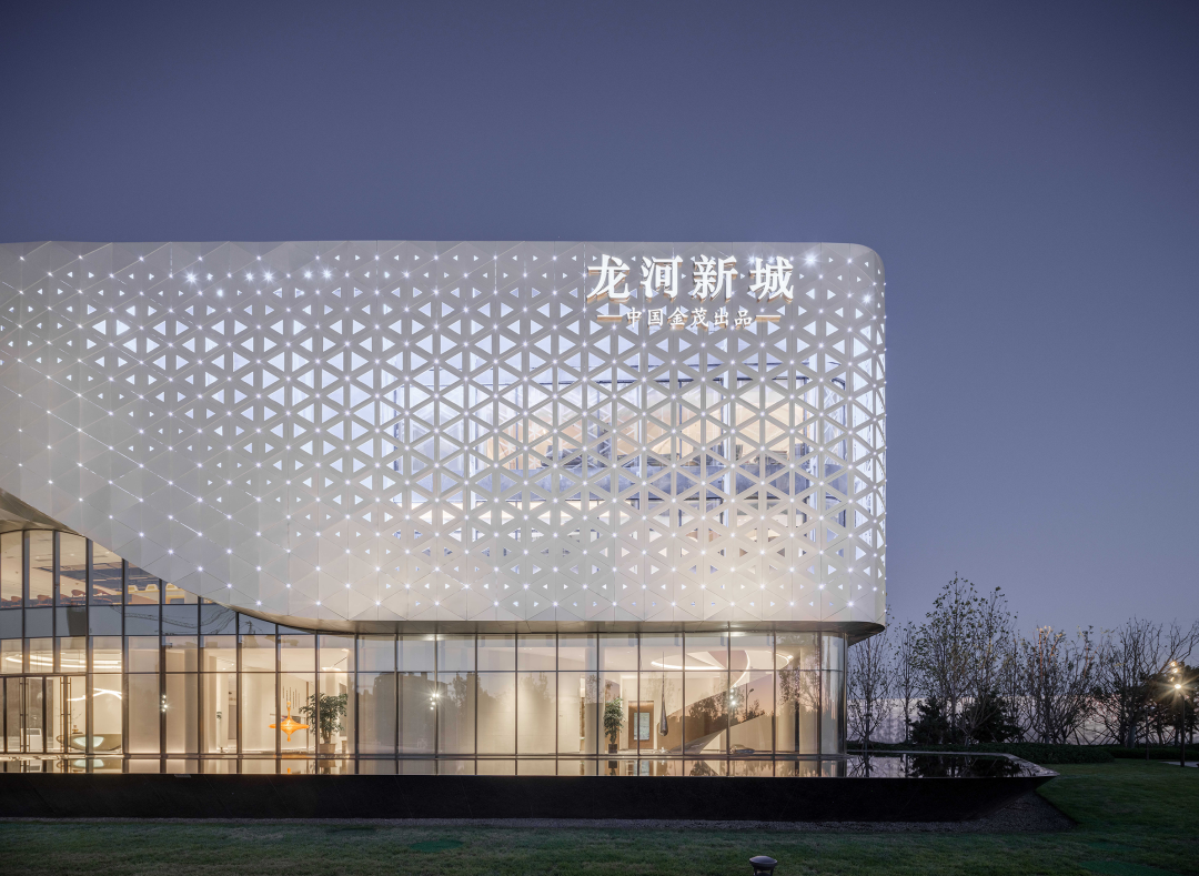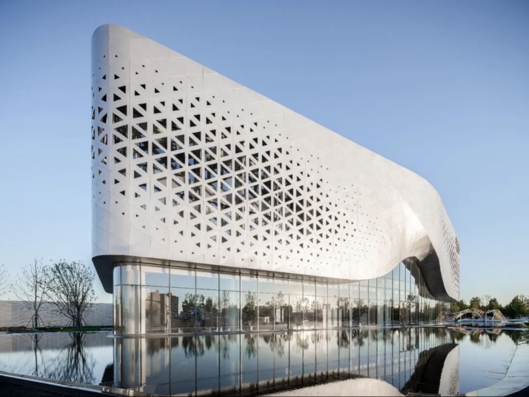 项目通过双曲铝板、穿孔板以及底层超白玻的材质组合,既凸显了建筑的雕塑感和现代感,又确保了视线的通透性和与景观的互动性。