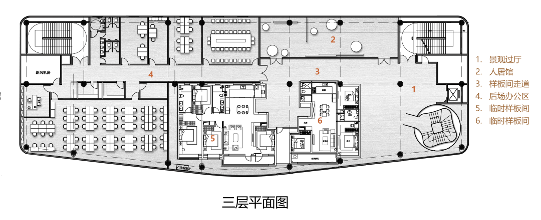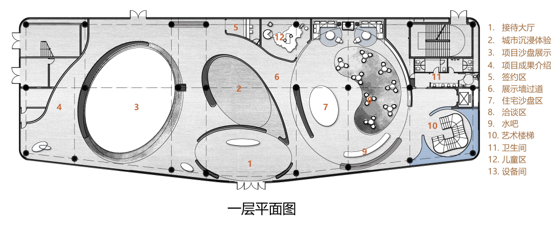 建筑共三层,主要功能为城市展馆及品牌展示中心,首层以对外展示为主,三大展区有机串联为来宾打造沉浸式观展体验,二层生活展示空间及儿童活动区,三层人居馆,布局高效合理,为廊坊人民呈现一个高品质的“未来生活美学馆”。