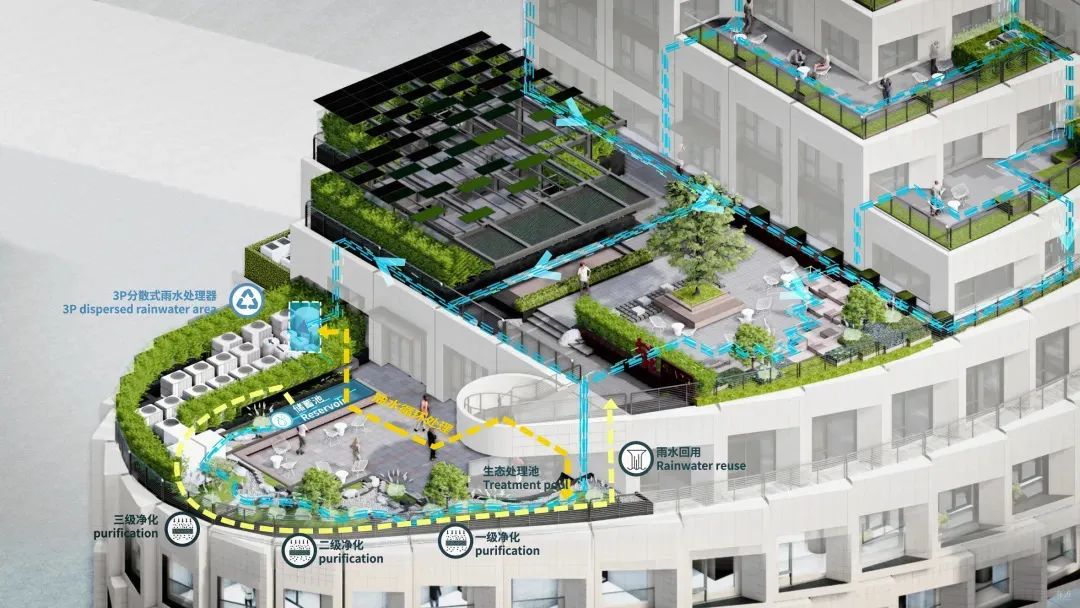 项目可持续设计以全生命周期为导向,注重实用性与经济性平衡,并对施工进行全程指导和监管。具体措施包括:结合被动式设计,大幅提升围护结构的热工性能;创新应用光储直柔能源系统与雨水净化景观一体化技术;室内环境采用健康优化策略等。