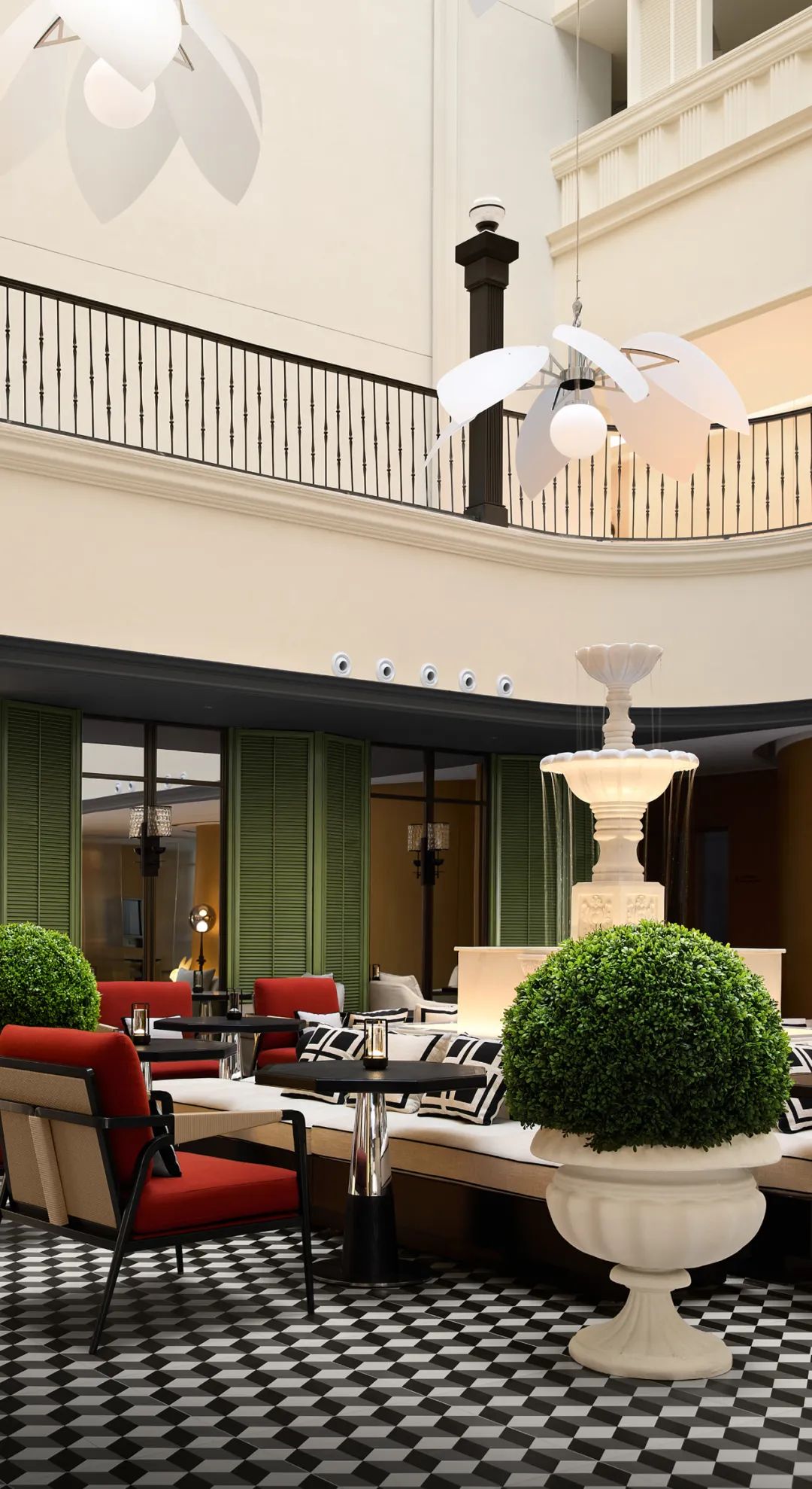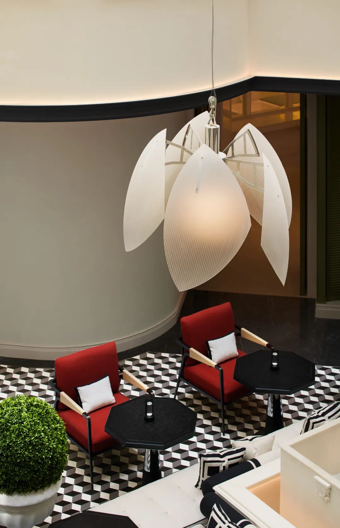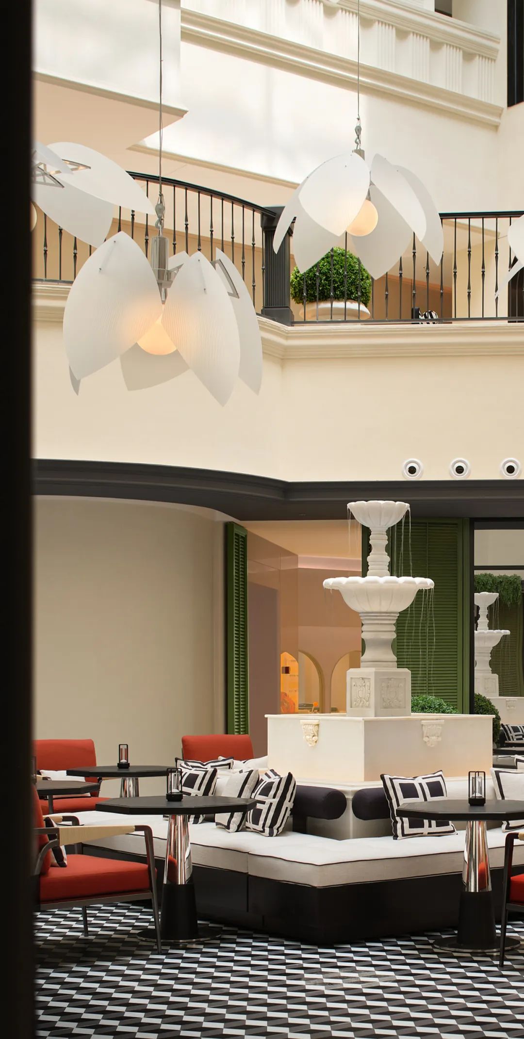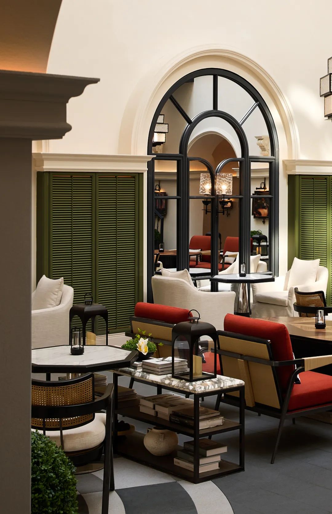 The landscape design elements are introduced into the atrium. The quiet sunlight spills into the "courtyard", on the flower table and among the tables and chairs.