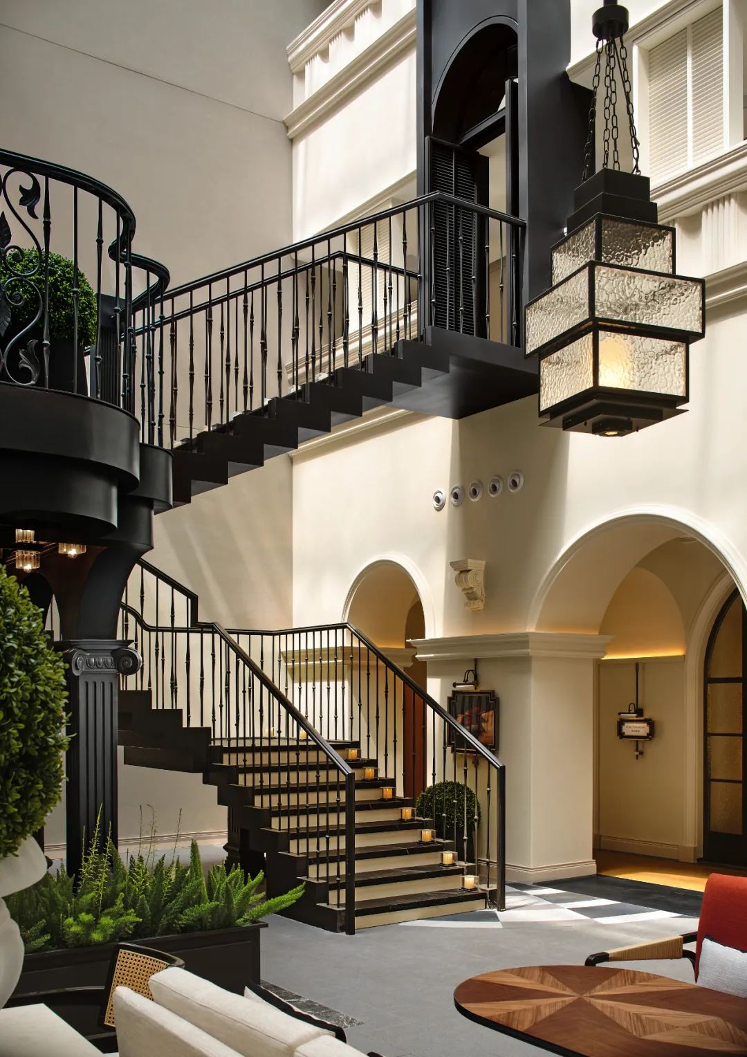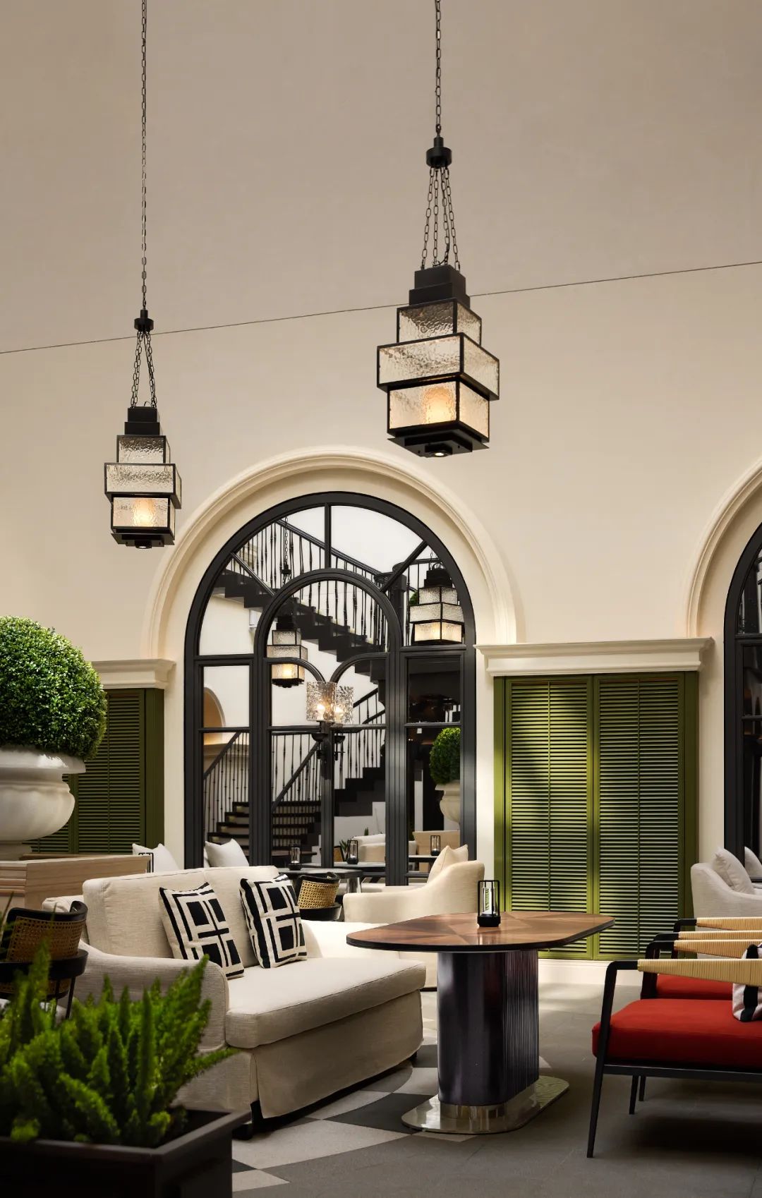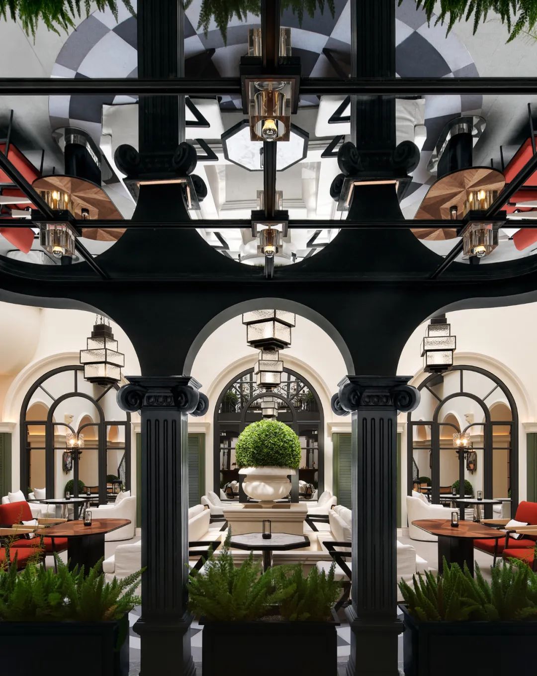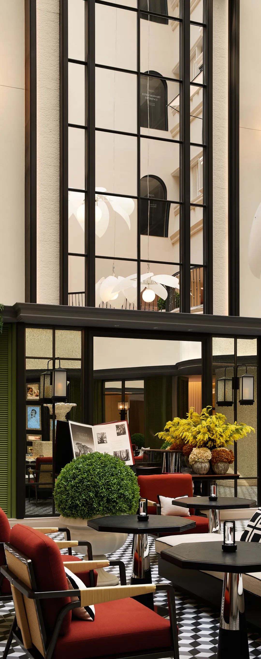 The landscape design elements are introduced into the atrium. The quiet sunlight spills into the "courtyard", on the flower table and among the tables and chairs.