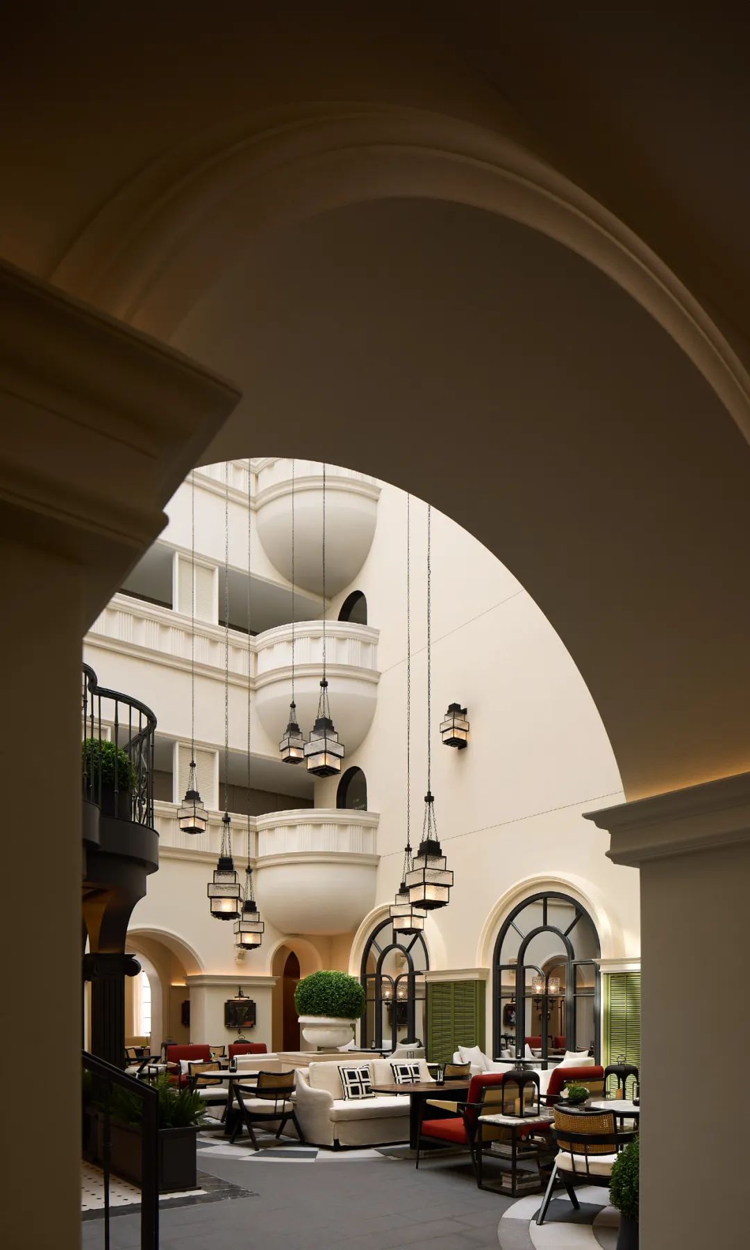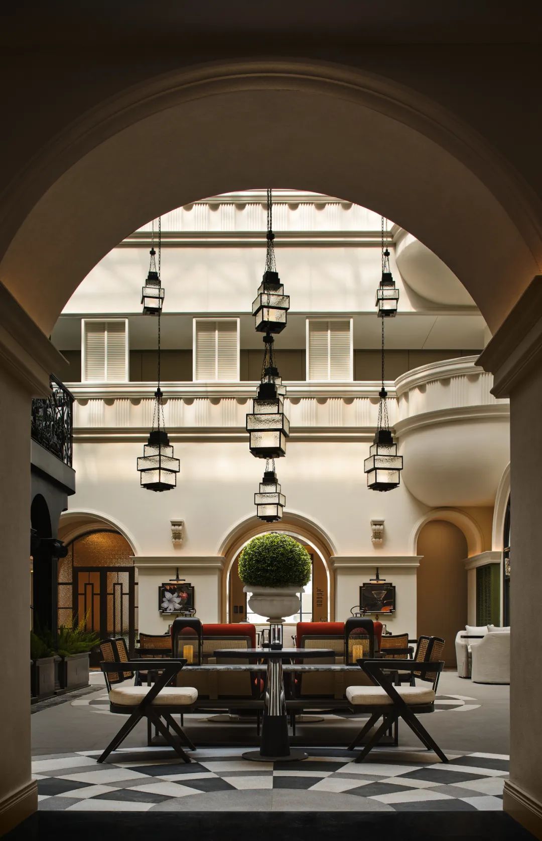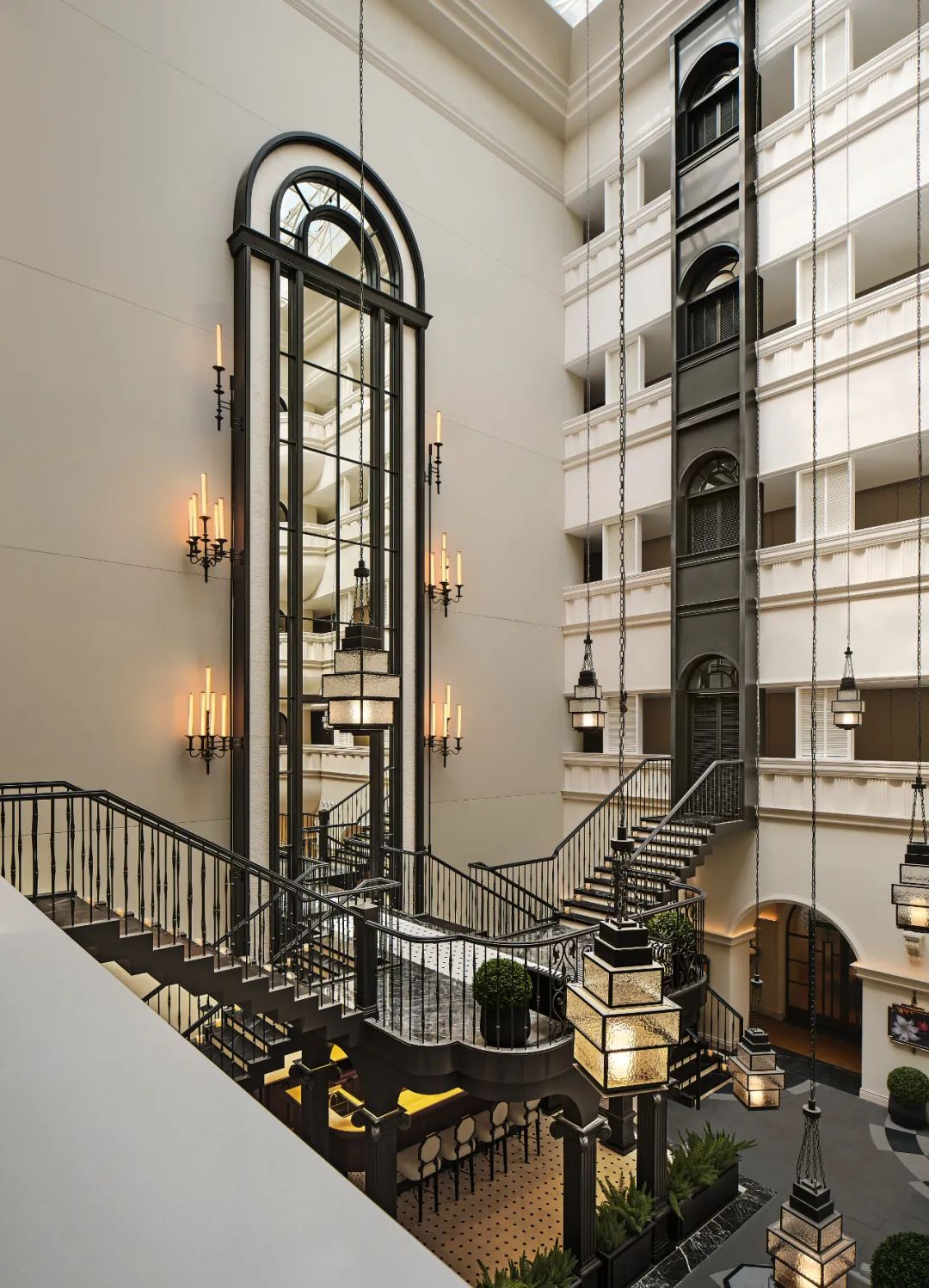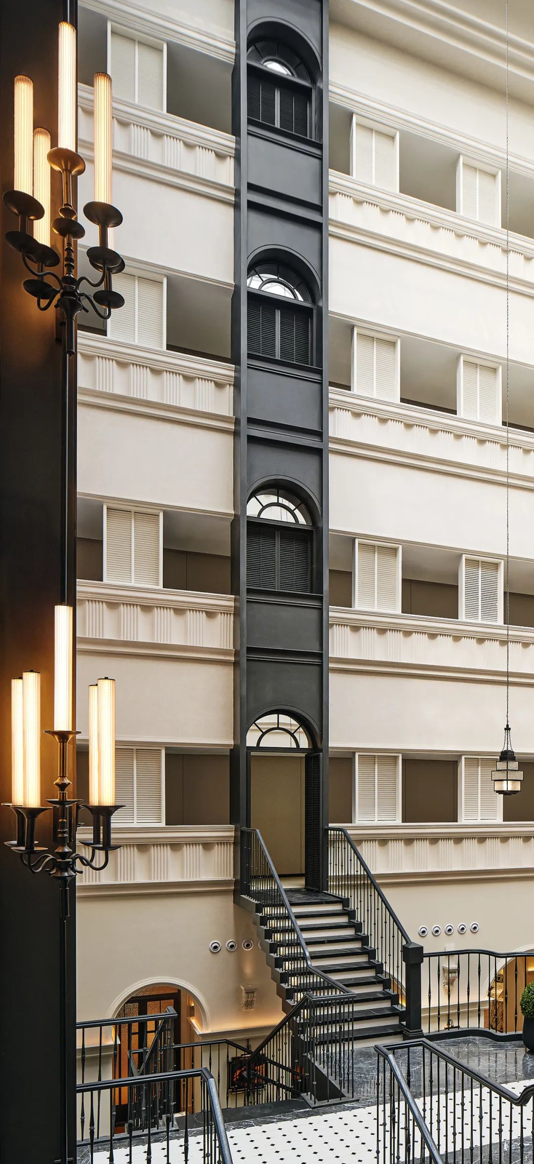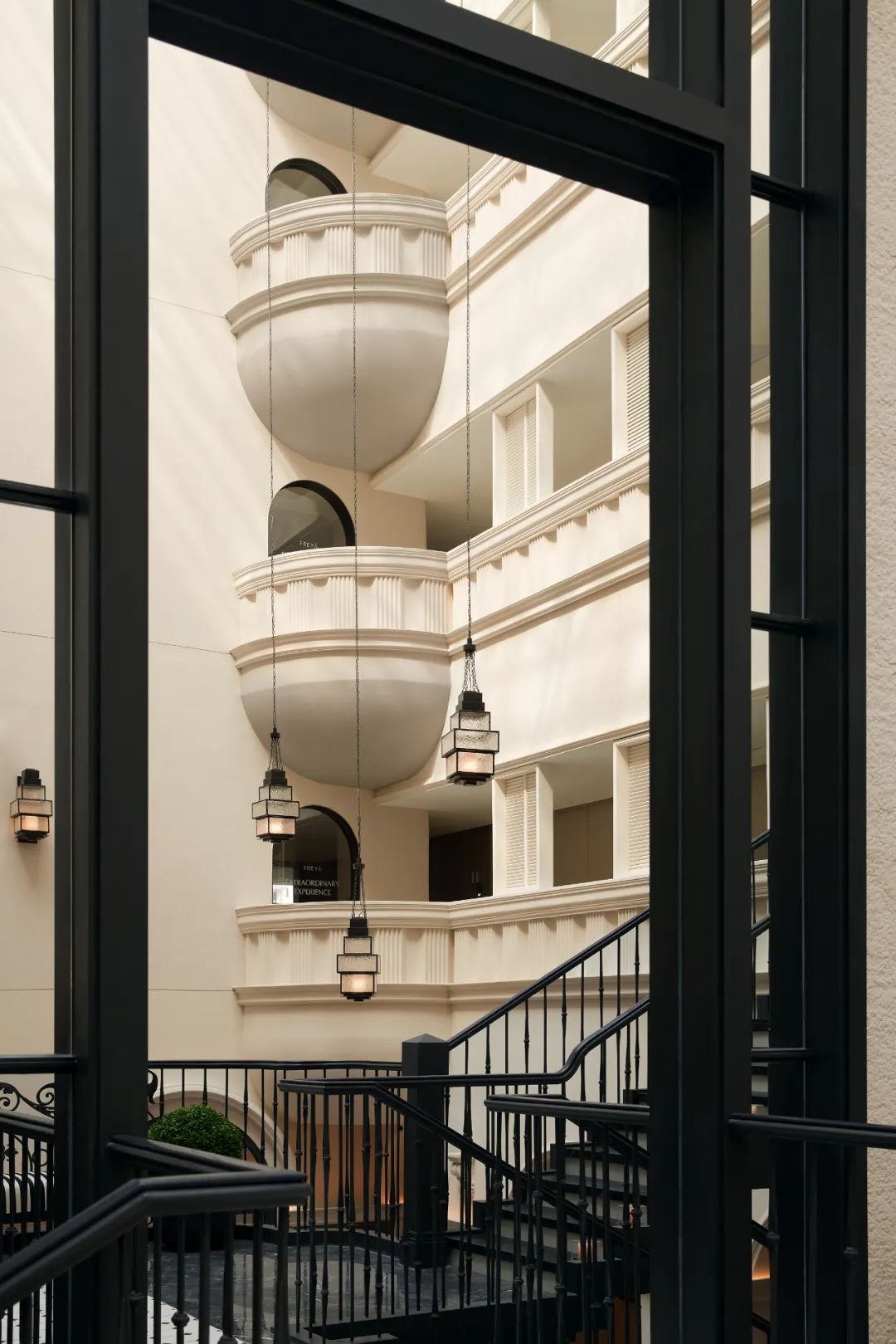 在阳光中庭“架桥”,连接中庭两侧,并在转换平台下方配套综合服务吧,营造富有仪式感的立体动线,为用户提供服务的同时,也成就空间亮点。