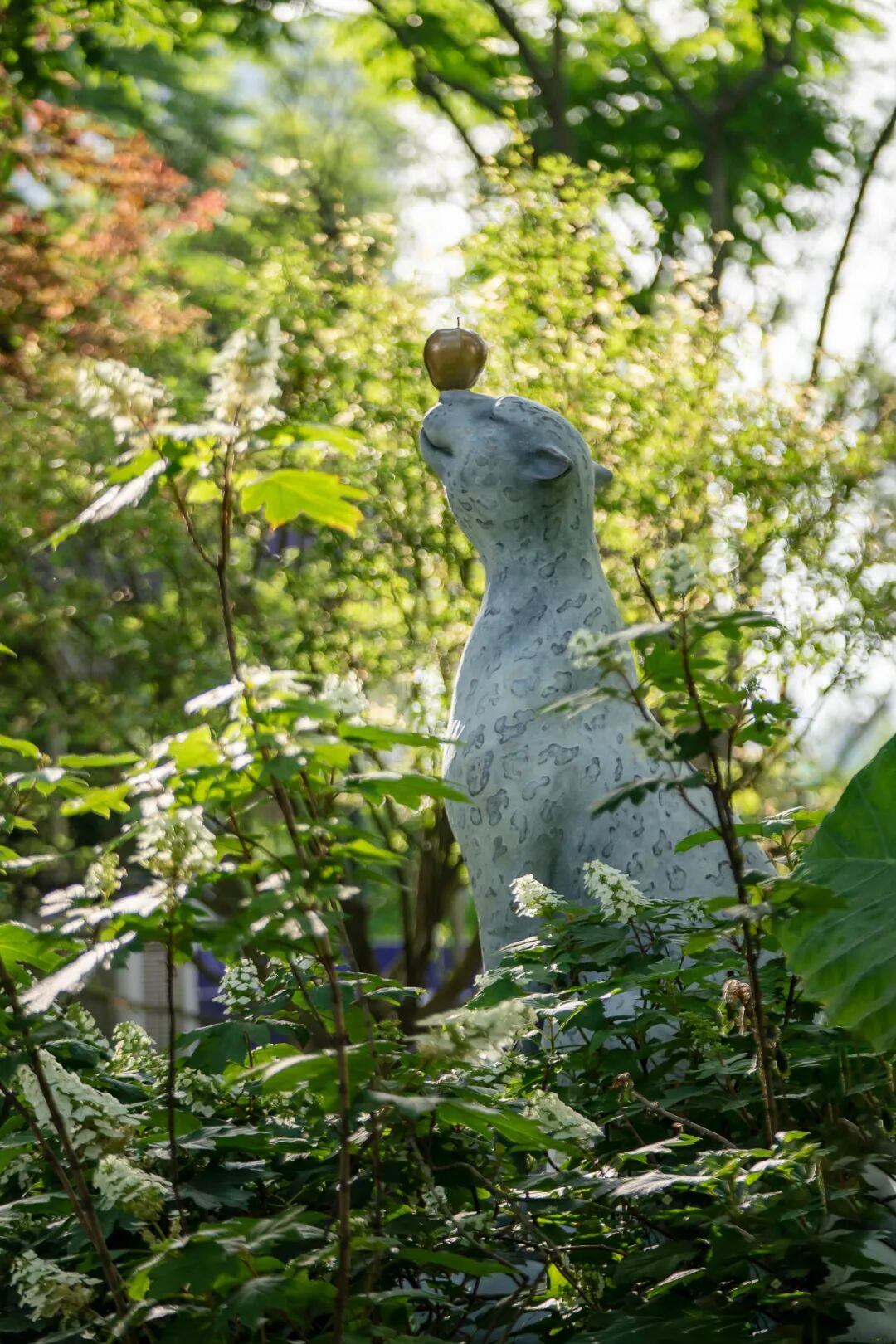 一只名为“沄豹”的纯铜猎豹,隐身林间,身体表面布满松鳞般的纹理,在阳光下泛着金属幽光。他尾巴上的小鸟并非猎物,而是共栖者。“野性”力量从来不是强硬的征服,而是身为强者时对弱者的垂爱。