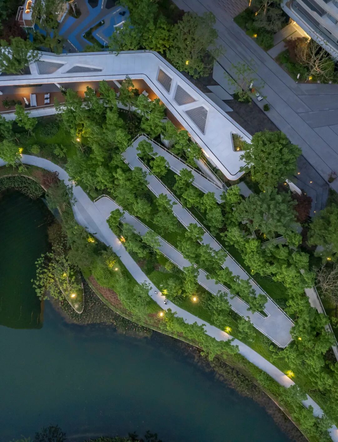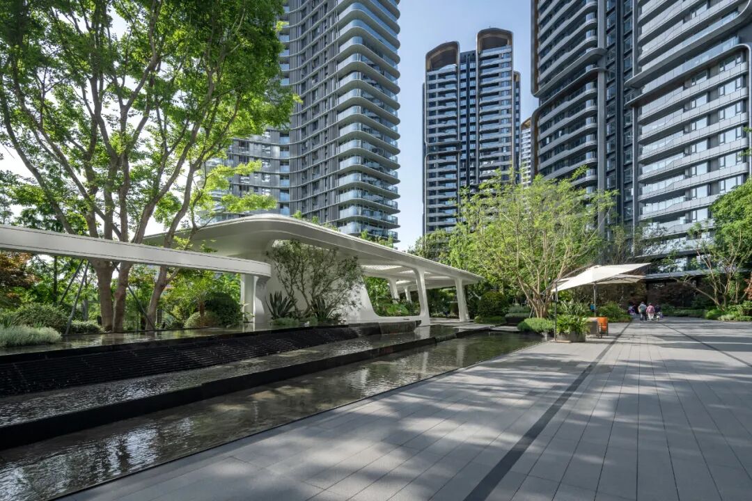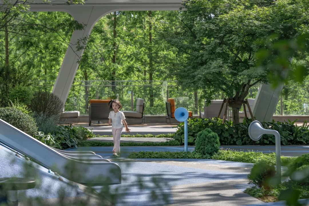 在临湖区域,社区打开着看不见的“门”。我们对项目边界进行了破除,让场地周边的生态绿地,如液体般渗透进社区肌理。人们可于此自由地穿梭于家与公园之间,享受自然与城市的双重馈赠。