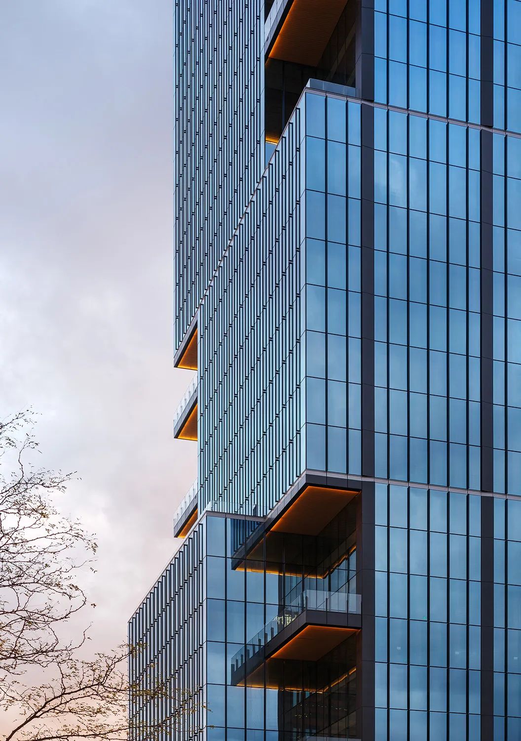 建筑外部竖向立柱形成立面分格,随着过渡区改变方向。立面透空挑出的装饰翼为高性能单元式幕墙提供了丰富的纹理,并不断反映光影的变幻。