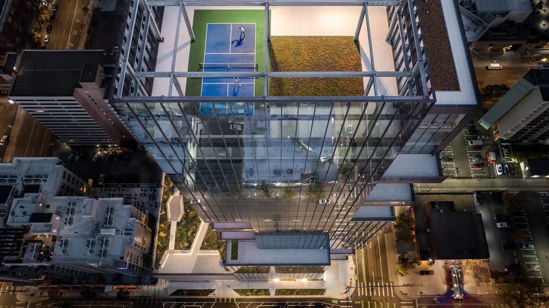 该建筑设计采用独特的阶梯式体量,使室内外环境更好地融合为一体。建筑上的阶梯式结构形成11个私人租户露台,主楼第七层配套设施层通向宽敞的10,000平方英尺(约930平方米)的公共配套设施露台,面朝库尔斯球场和远处的落基山脉。该配套设施露台兼作停车平台的绿色屋顶,包含各种景观设计、座位区以及专为互动和休闲设计的开放空间。大型可开启的玻璃幕墙将配套设施层的其他部分开放,包括先进的健身中心、多功能会议中心、多功能会议室、接待级休息室和高尔夫模拟器。其他共享配套设施空间包括一个屋顶活动平台,拥有世界上最高的户外匹克球场,并享有全景视野。