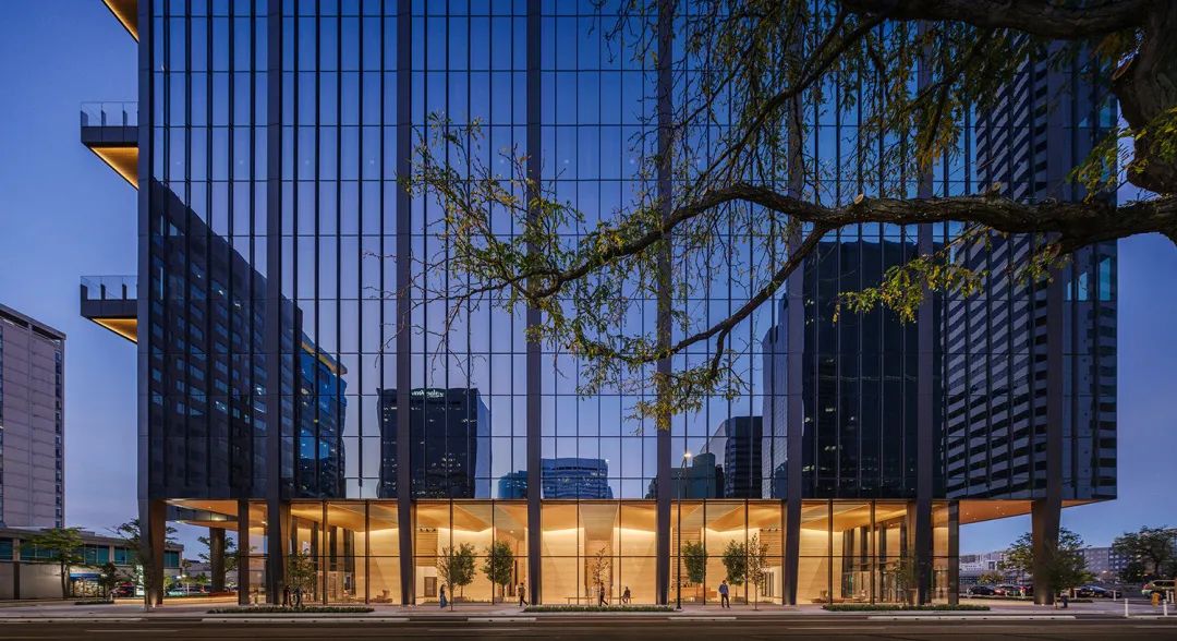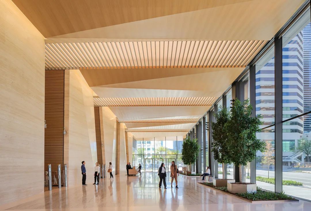 建筑底层处于南角和西角的两个公共广场之间,设有丰富的餐饮设施。大堂横跨整个19街街区,是户外环境的自然延伸,高度透明的玻璃幕墙模糊了室内外的界限。通高的折叠洞石墙在入口处成为引人注目的视觉焦点,令人联想到丹佛周边的自然美景。
