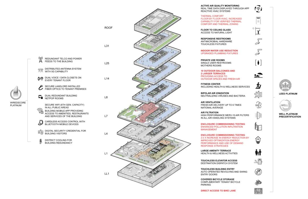 该项目标志着滨江投资开发公司与GP的第四次合作,也是首次在芝加哥以外的合作项目。同一支开发-建筑团队还曾负责开发南运河320号(2022年)、美国银行大厦(2020年)和北河滨150号(2017年),这些项目均已获得LEED金级、WELL铂金级和WiredScore铂金级认证。劳伦斯1900号大楼目前已获得LEED和WiredScore铂金级认证,预计将于今年夏天晚些时候获得WELL铂金级认证。