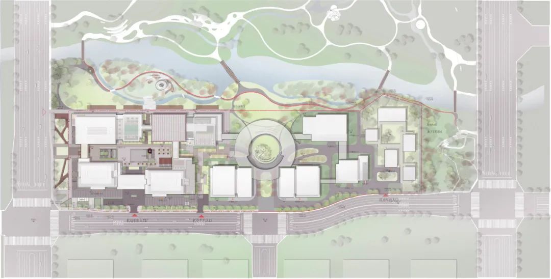 园区建筑与自然景观相辅相成,建筑间留出尺度适宜的景观及视觉通廊,使得北侧荷湖及绿地和谐嵌入场地,与园区内两处下沉庭院形成有机整体。同时,方案设置了生态的交通网络,通过二层的空中连廊,激活连接各个建筑单体、共享空间及小型研发区域。延伸至此的绿化和景观,创造了层次丰富的公共空间。绿意环绕中,理性严谨的教育空间塑造了冷静、专注的研发场所,开放多元的互动空间则提供了活力多彩的休憩活动环境。二者共同塑造出一个专属于师生们的理性又浪漫的公园里的书院。