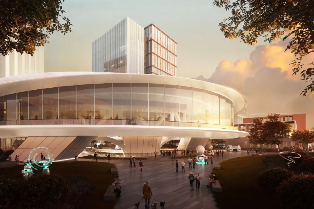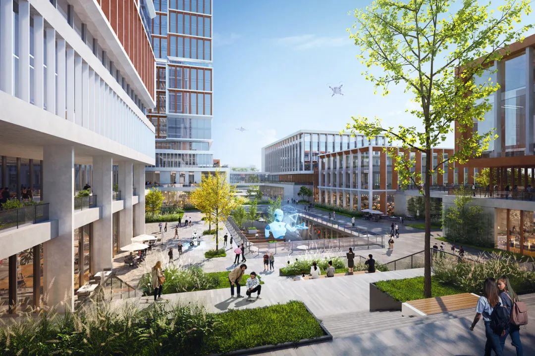 方案还独具匠心地将当下热点推进的全龄友好理念与低空经济概念融入方案思考,打造出独具特色的创新发展模式。园区致力于满足不同年龄段人群的需求,从儿童到老人、残障群体,都能在园区内找到专属的舒适空间与丰富的活动场所。建筑的露台、屋面及广场为无人机着陆提供便捷的场地,既响应国家低空经济发展战略,又为园区创造新的增值服务空间。