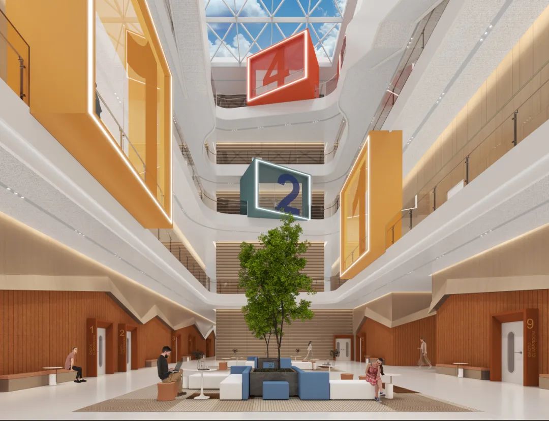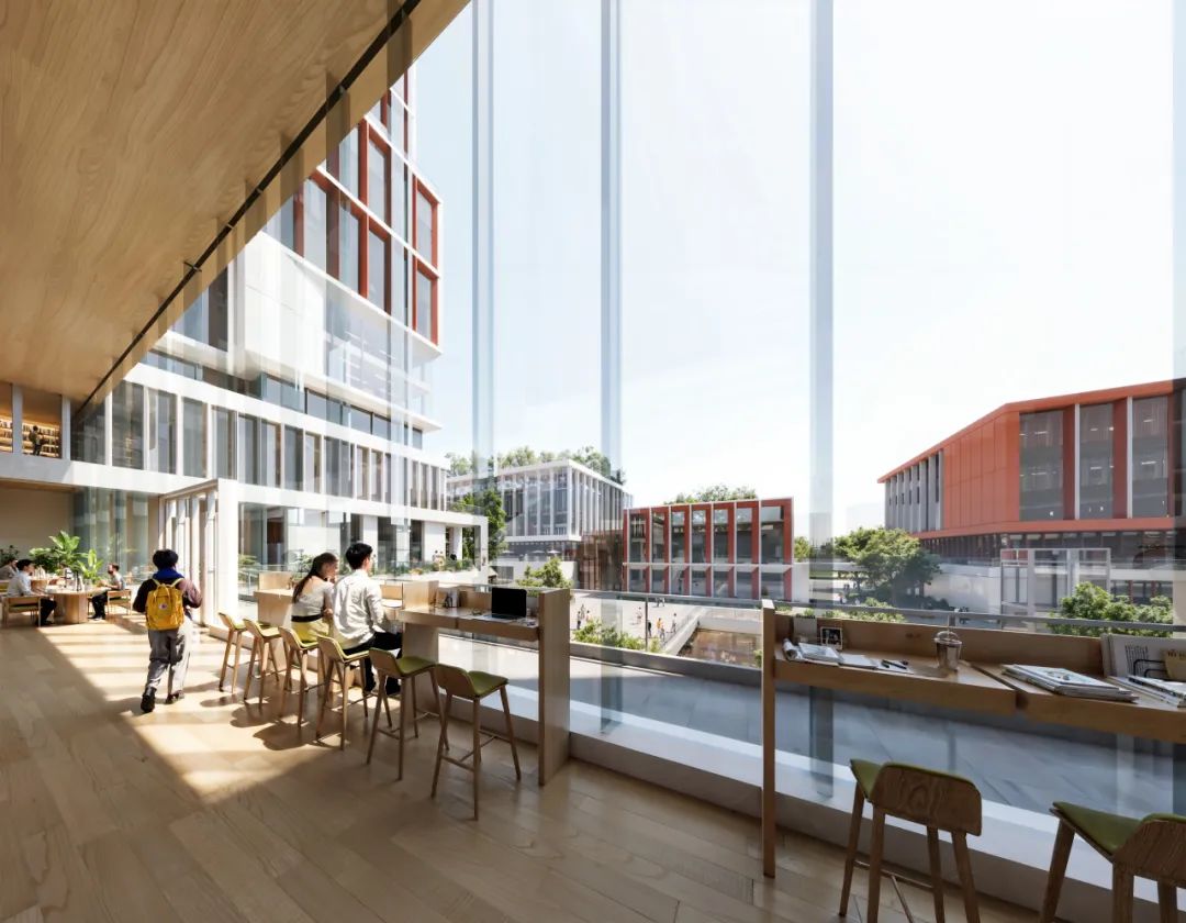方案整体设计理念植根于传统又放眼于未来,既传承了中国传统书院以院落为空间组织方式与自然共生、具有浓郁的人文气息之精髓,又力图营造出自由、开放、共享的学习环境。教研空间不拘泥于传统封闭教室的形式,而是提供多样化丰富的无界学习场景:室内空间可分可合,使用更为灵活弹性,阳光中庭、通高边庭分散于楼宇之中,为师生多元化学习创造良好条件。这里不仅是一个拥有弹性空间的高效交互场所,一个协作无界的交流平台,更是一个资源集聚的创新枢纽与开放共享的辐射原点。