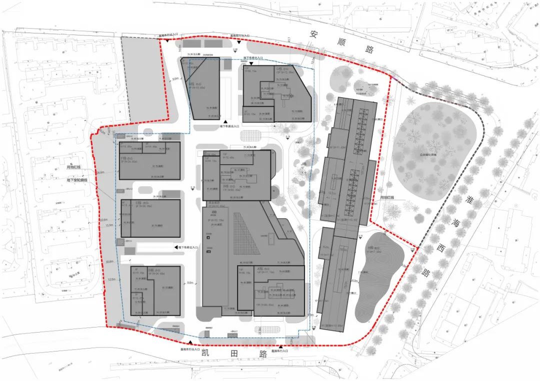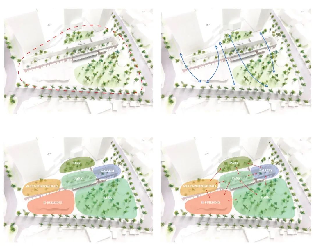 场地更新前建筑密度较低,结合周边地铁等公服设施的配给,本轮更新通过新建办公和商业提高场地建筑密度和总建筑量,以提升开发强度。新建建筑被策略性地布置于文物建筑的北侧,形成街区内街路网,与文物建筑和其南侧城市绿地公园共同实现主次有序的空间分区。由此,项目实现了历史风貌展示、公共空间构建与城市活力引入三者的有机统一,构建出一条联通城市界面、文物节点与街区内部的开放性城市空间路径。