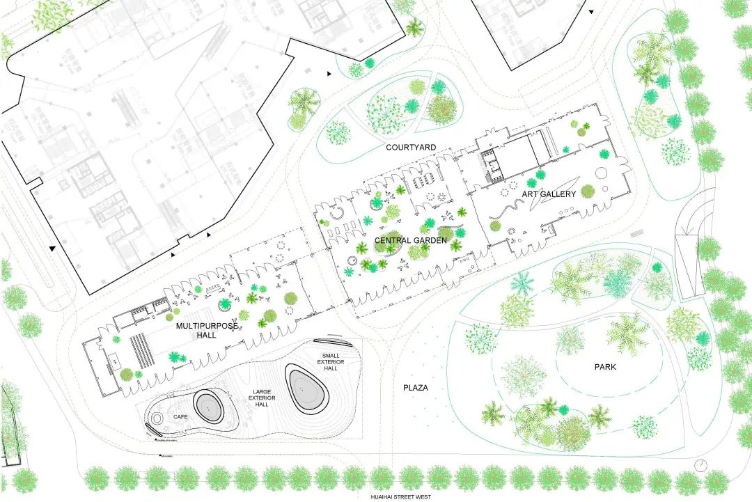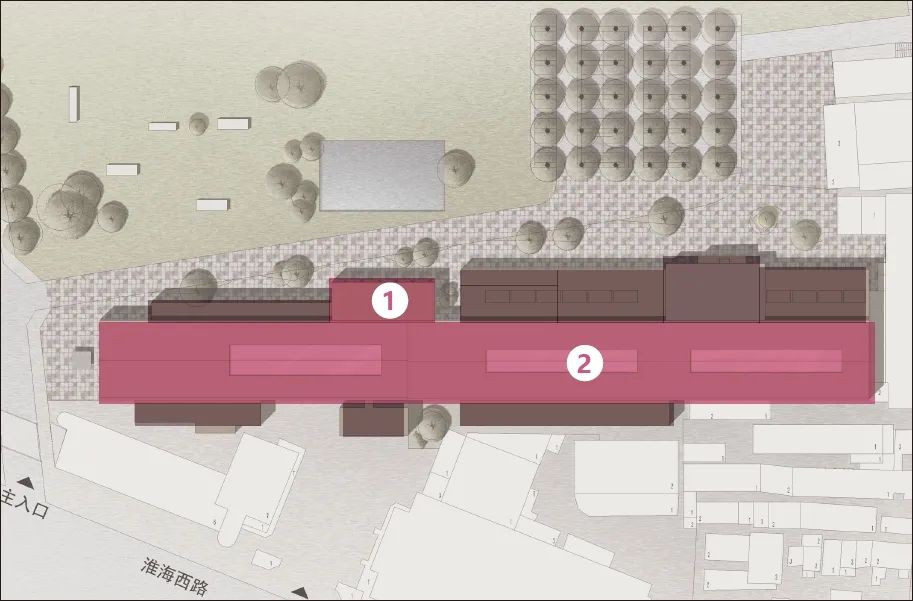 文物建筑南侧设立开放式绿地公园与一座雕塑建筑,沿淮海西路构建可达、可游、可停留的公共空间,吸引行人停驻,也引导人流自然进入文物建筑,从而将市政道路与街区内部空间紧密串联,激活更新后的整体片区。