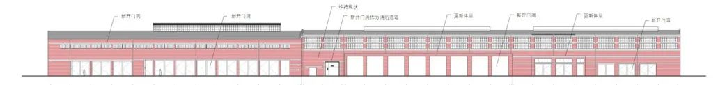 本次工程保留厂房各个立面的历史原物部分,对破坏历史风貌的非历史原物部分采用和历史原物协调统一的设计语言,按原体量、轮廓进行更新。在主体厂房的两个长立面上新增大尺寸门扇,而在南北两侧的辅房立面上仅开设门洞,形成灰空间,将建筑南侧的广场、绿地和北侧的内街串联起来,打通视线和流线,进一步提升建筑的公共性。