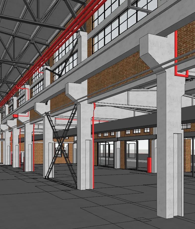 建筑师通过模型推敲管线排布策略。厂房空间内的机电设备和管线主要集中于行车梁上方,一部分尽量紧贴行车梁顶面,另一部分尽量紧贴屋架底面,将对高窗的遮挡降到最低。厂房中部北侧辅房的喷淋系统布置也结合了混凝土薄腹梁和屋面槽形板的分格与走向,尽量削弱其对空间的影响。