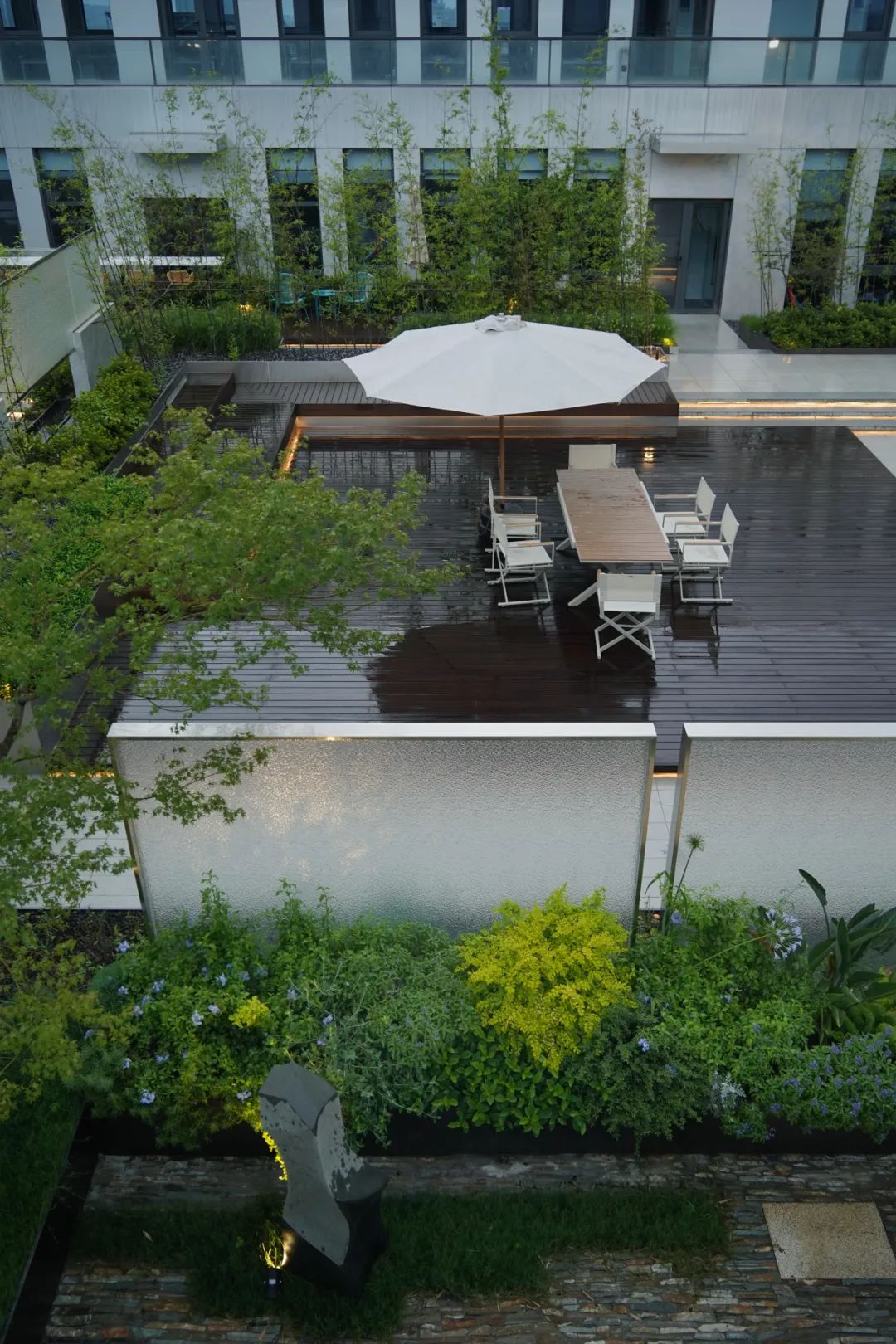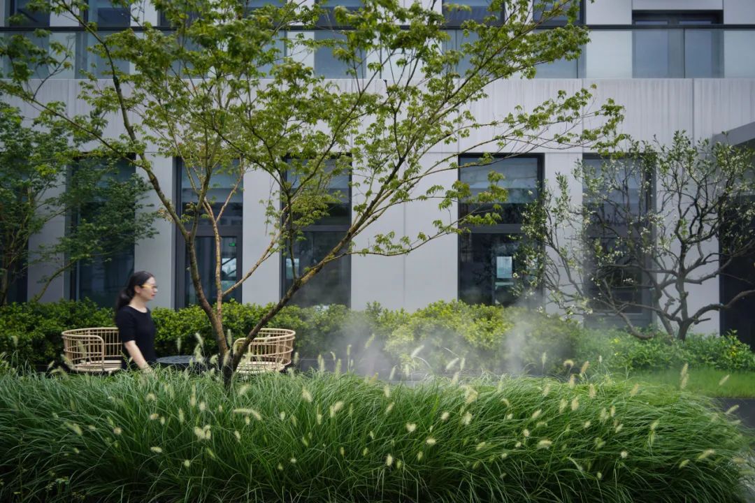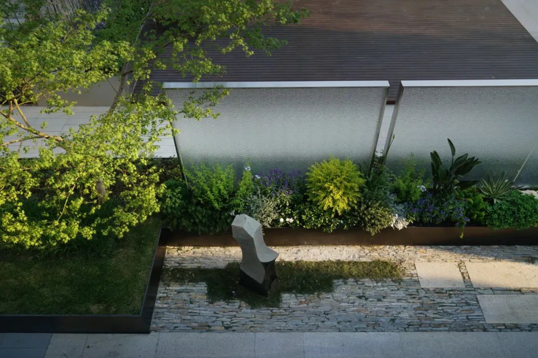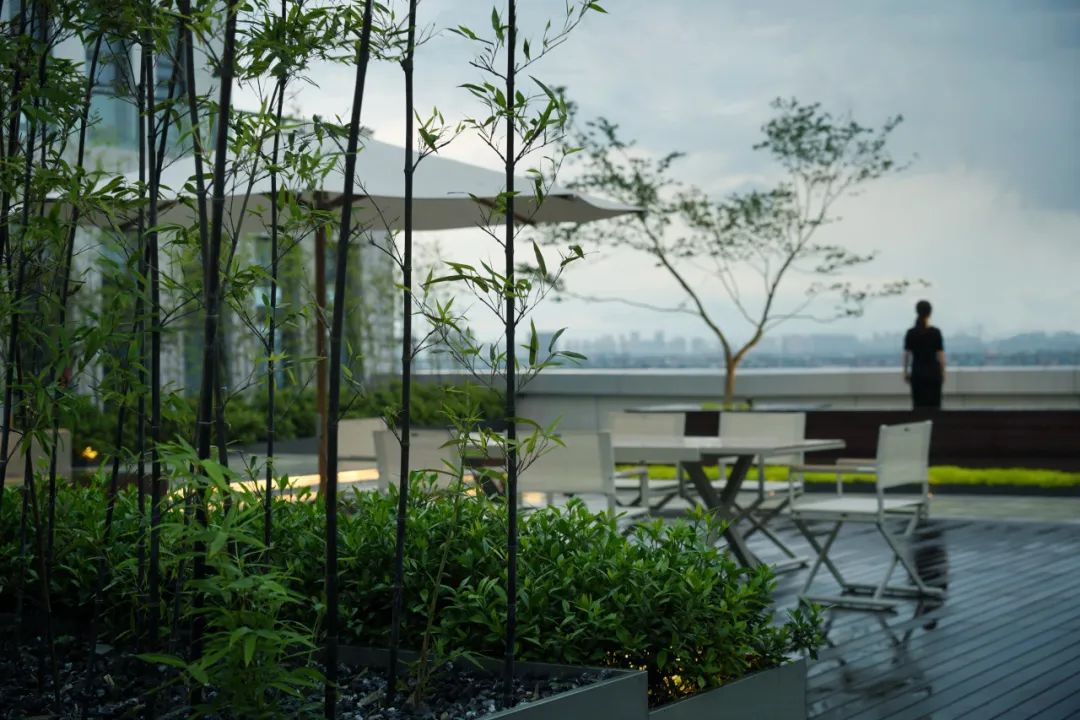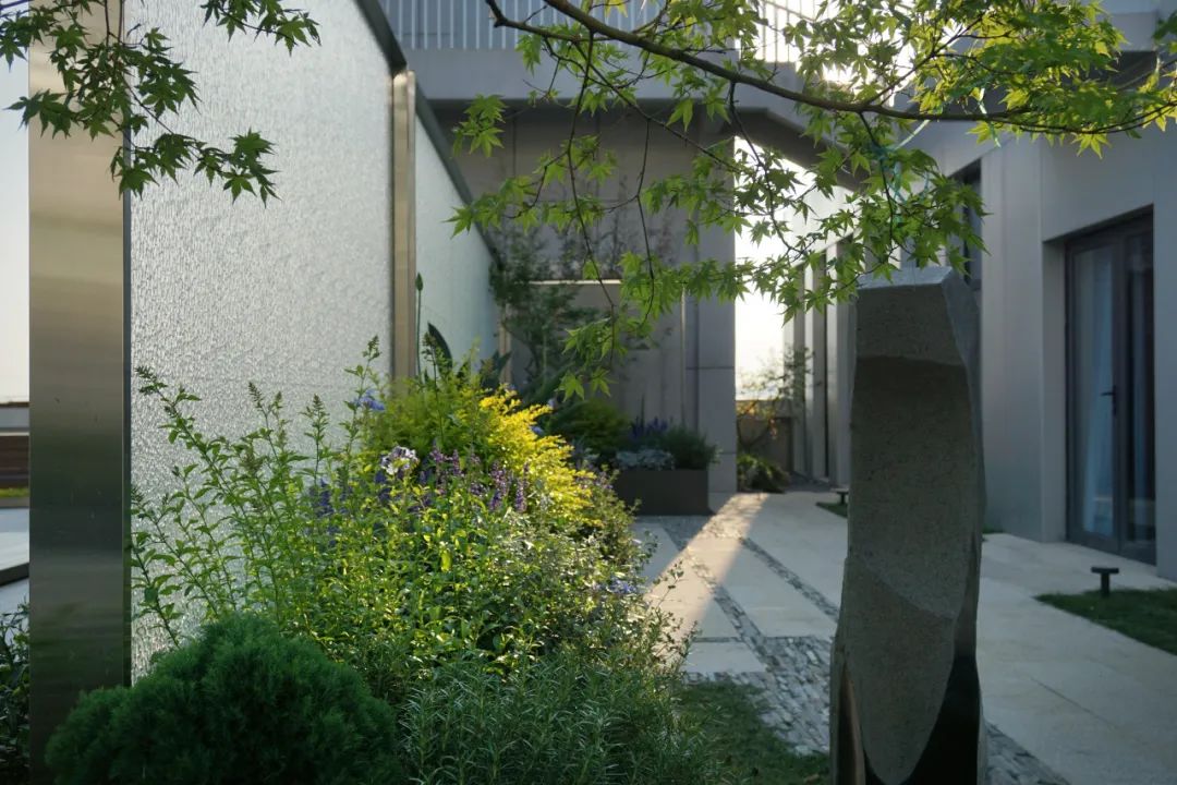这个项目最满意的点是光照与竹子,花境,玻璃之间的光影关系。纵向线条与横向线条的碰撞关系还有平台,台阶,树池之间的高差关系。