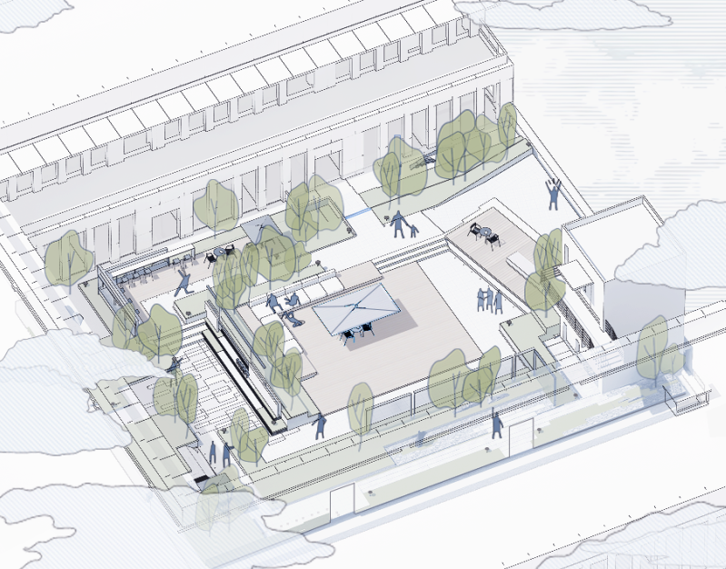 动区(中部/西侧):中部作为核心聚集点,容纳休憩与社交活动;西侧露台则转化为瞭望花园,结合观景平台与休憩座阶,引导视线延伸。