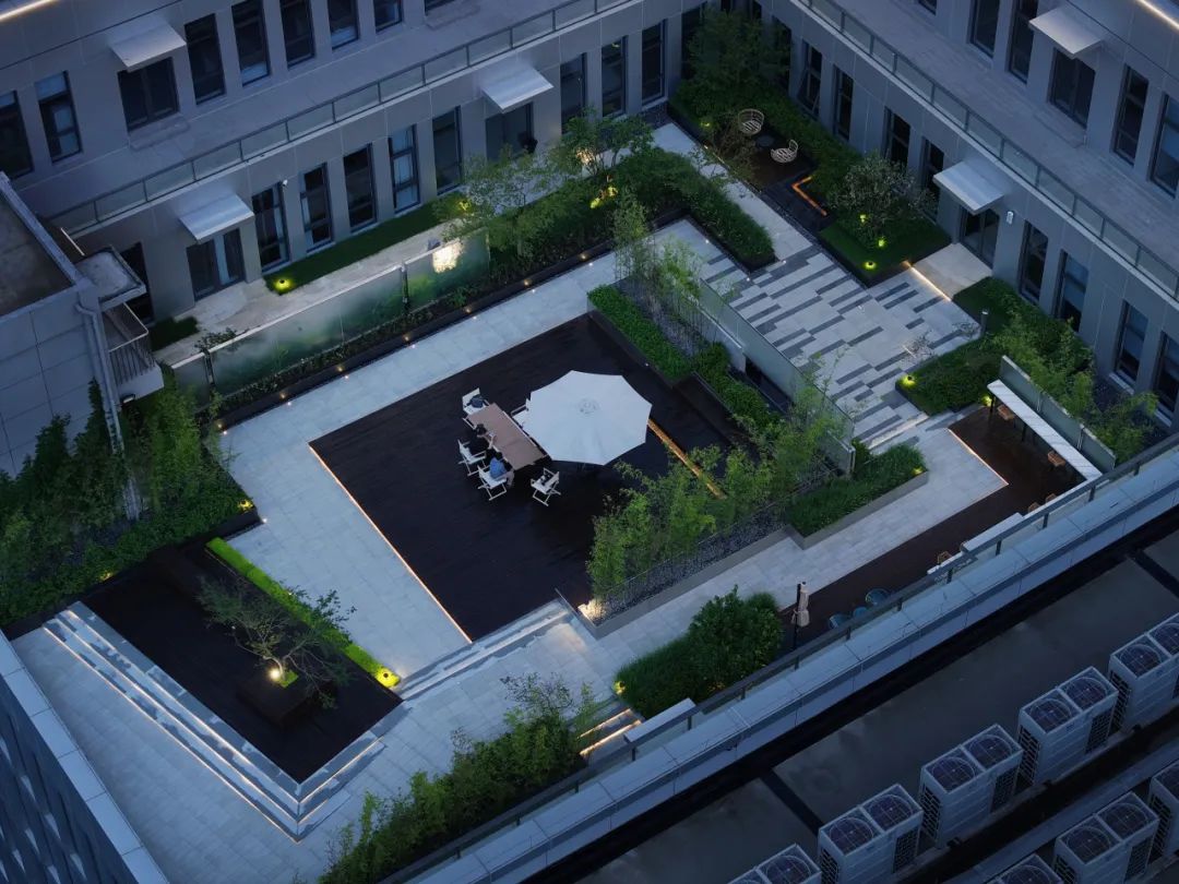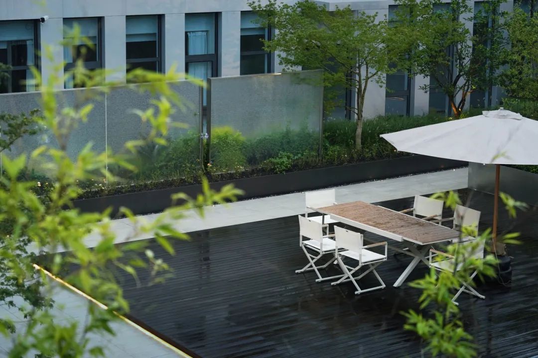 屋顶花园以凹字形平面围合700㎡空间,西侧露台借景远眺,北侧衔接餐厅走廊,东侧为员工茶歇区,南侧毗邻办公会议区。设计通过“动静分区”呼应室内功能: