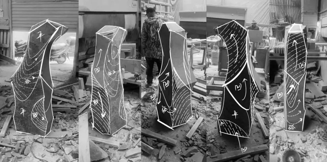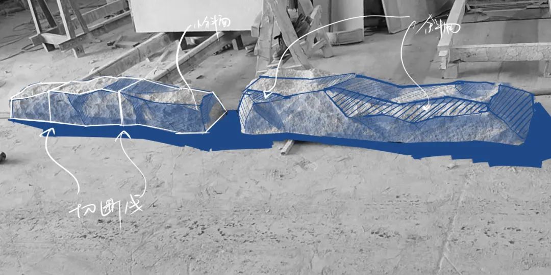 首先在置石选择上,每一块石材都先通过尺寸标注和手绘表达后再反推到模型确认体量。现场根据尺寸选择石材样式进行加工,并且由于选择的石材尺寸体量都较小,不宜采用大石块进行爆破形成相对自然的爆破面层。因此相当考验开凿技术,需要现场把控,确保每个面层相对自然又有人工开凿痕迹。