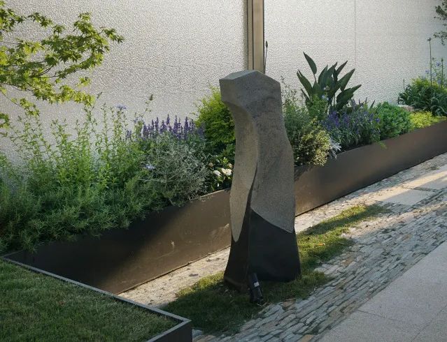 景石雕塑被巧妙安置在一处静谧角落,成为空间中的视觉焦点。当宾客用餐或参观时,透过通透的玻璃幕墙,雕塑与精心搭配的花境构成一幅动态的艺术画框。