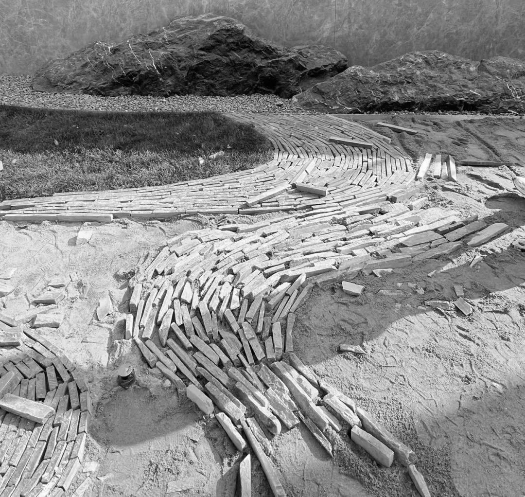 最后是片岩立铺工艺的运用:精选2-3种自然面层的细长片岩,通过长短错落的交替铺设形成有机肌理。这种工艺对施工技术要求较高,需根据现场实际灵活调整铺装效果。