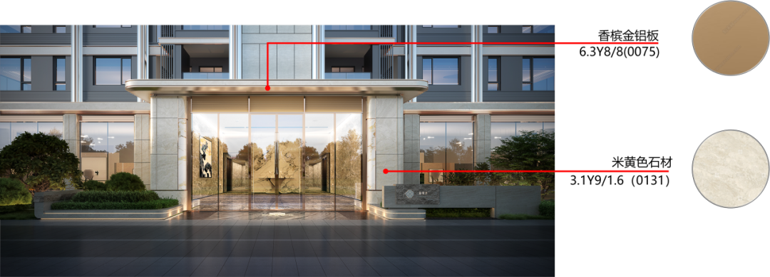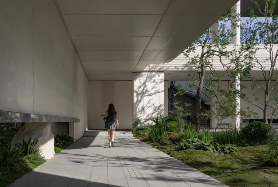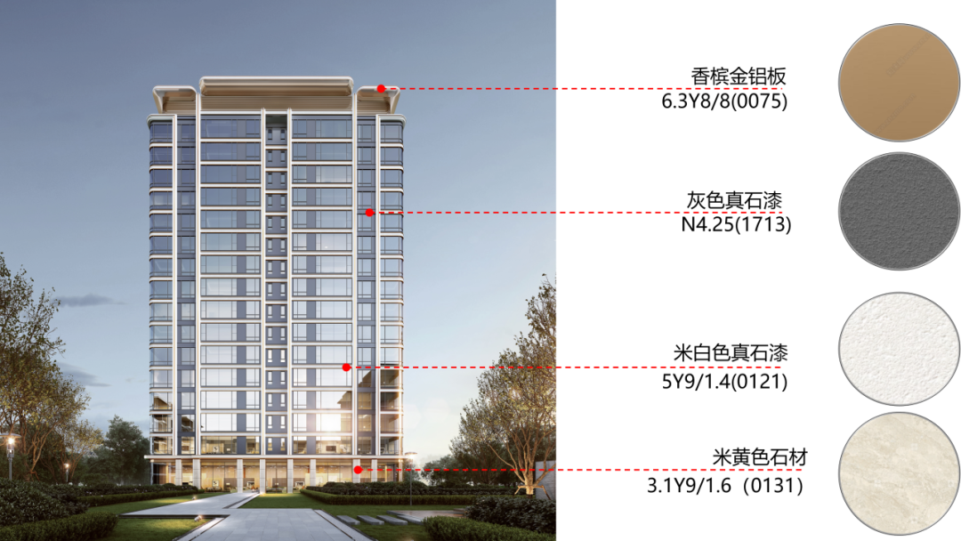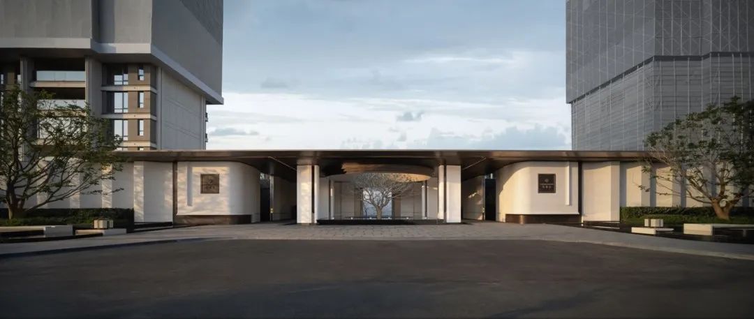 建筑立面整体着重采用浅色系材质,浅色所营造出的明亮、通透之感,能为空间赋予优雅、大气的基调,带来开阔且舒适的视觉体验。局部巧妙运用灰色材质进行适度压制,可避免空间过于轻飘、单调,灰色沉稳的特质能起到平衡作用,增添空间的稳重与质感。