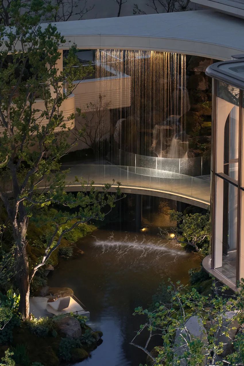 通过层层飞瀑跌水,打造丰富的景观层次。引雪山活水穿庭而过,七叠飞瀑如悬空白练,书院游廊凌空架于水雾之上,穿行时可见《水经注》石刻与当代光影交织,在悬瀑高差间完成"从冰川到文明"的诗意转译。
