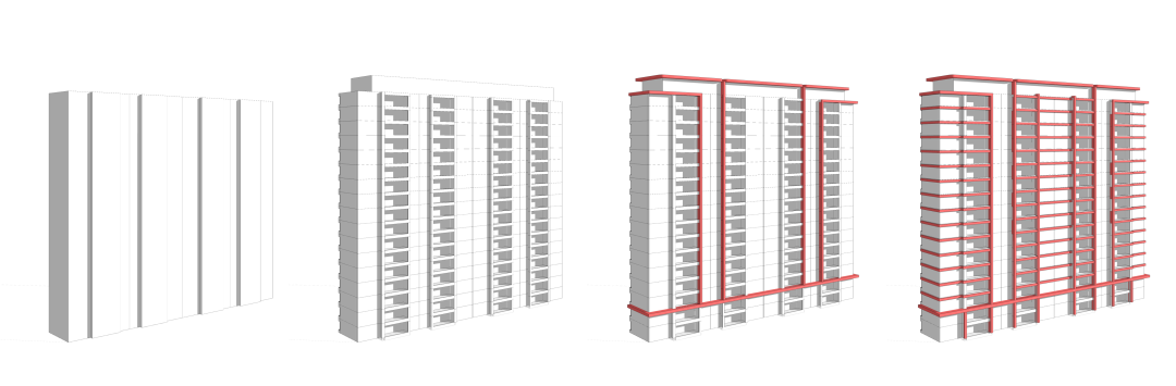立面设计根据平面为基础,将体块依靠功能需求进行黄金比例划分。