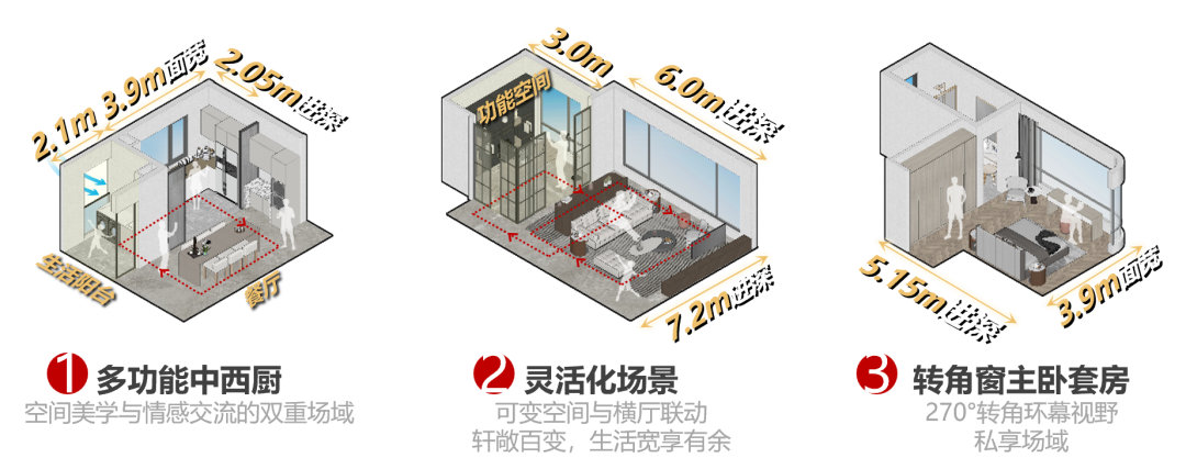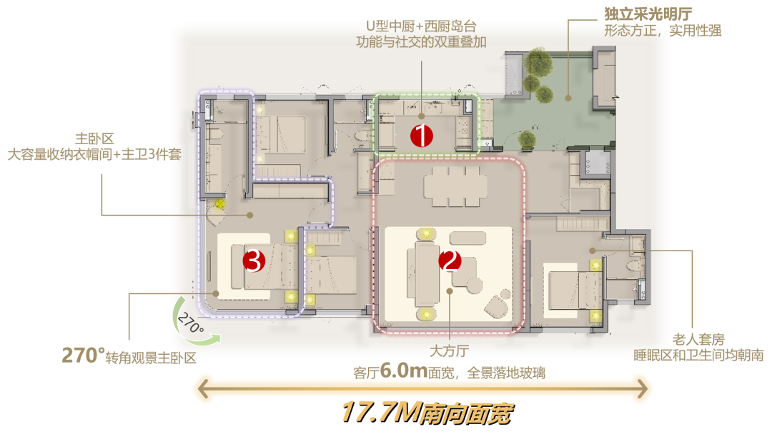这个户型亮点十足!客厅拥有 6.0m 阔绰面宽,搭配全景落地玻璃,阳光与美景肆意倾洒,空间通透又敞亮。U 型中厨搭配西厨岛台,巧妙融合功能性与社交性,让烹饪与交流相得益彰。可变空间与横厅联动,轩敞百变,生活宽享有余。