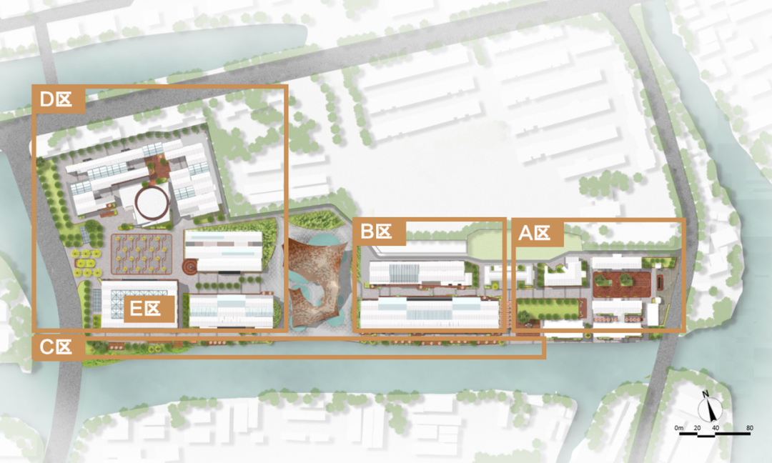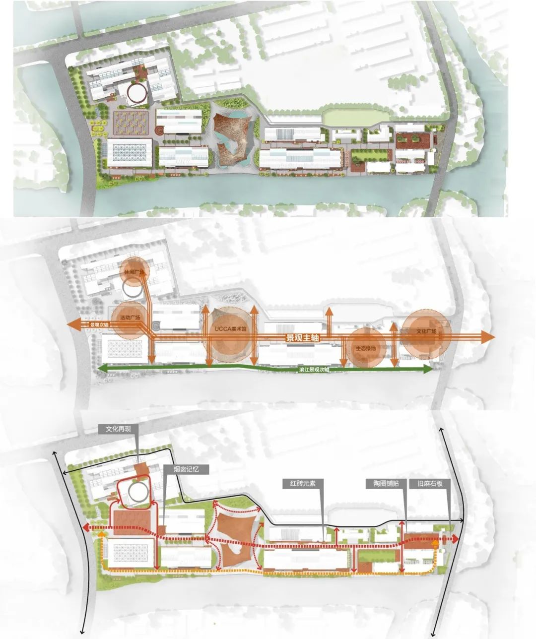 基于对场地历史脉络与空间肌理的系统性梳理,设计确立了以工业遗产为空间叙事基底的总体策略。围绕UCCA陶美术馆打造东西景观主轴与滨江次轴,形成连贯的游览路径。通过增设过渡空间作为叙事节点,让游客在移步换景中体验紫砂技艺与千年文化,实现文商旅融合,营造出"可观、可感、可游、可居"的沉浸式陶文化场域。