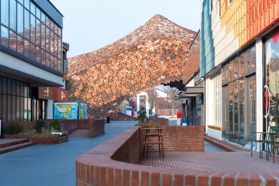 设计结合休闲座椅与艺术装置,为未来陶艺市集等活动预留弹性空间。同时,在绿化转角处以红砖铺地打造演艺区,将保留的老设备艺术化改造为露天舞台背景,使工业记忆以现代方式延续。这一系列措施既传承了历史文脉,又通过功能复合与空间重构,为场地注入新的活力,实现文化保护与空间复兴的有机统一。