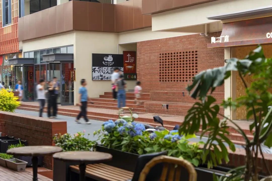 以UCCA陶美术馆作为陶文化的核心向外延展形成主要的商业街区,通过陶砖挡墙与花池丰富街道界面,设置手作工坊外摆区、商业与餐饮节点,形成丰富的室外停留空间;同时有机化解地形高差,自低向高,打造出一条兼具仪式感与文化内涵的"陶文化朝圣之路"。
