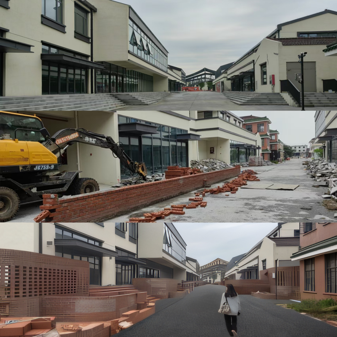 在保留既有建筑主体结构的前提下,仅对不足8%的非承重外墙进行局部拆改与增建,以最小干预实现空间活化。设计以回收陶砖为媒介,通过材料叙事重新编织场所记忆——将拆迁废料转化为具有文化符号意义的景观装置,赋予废弃材料新的生命,在有限的时间与空间条件下,以精细化微调实现功能升级与空间重构,探索一种低冲击、高灵活性的工业遗产再生策略。