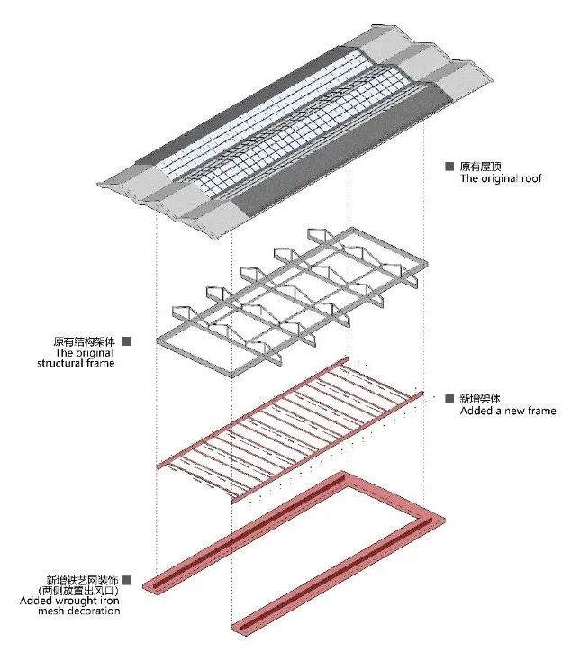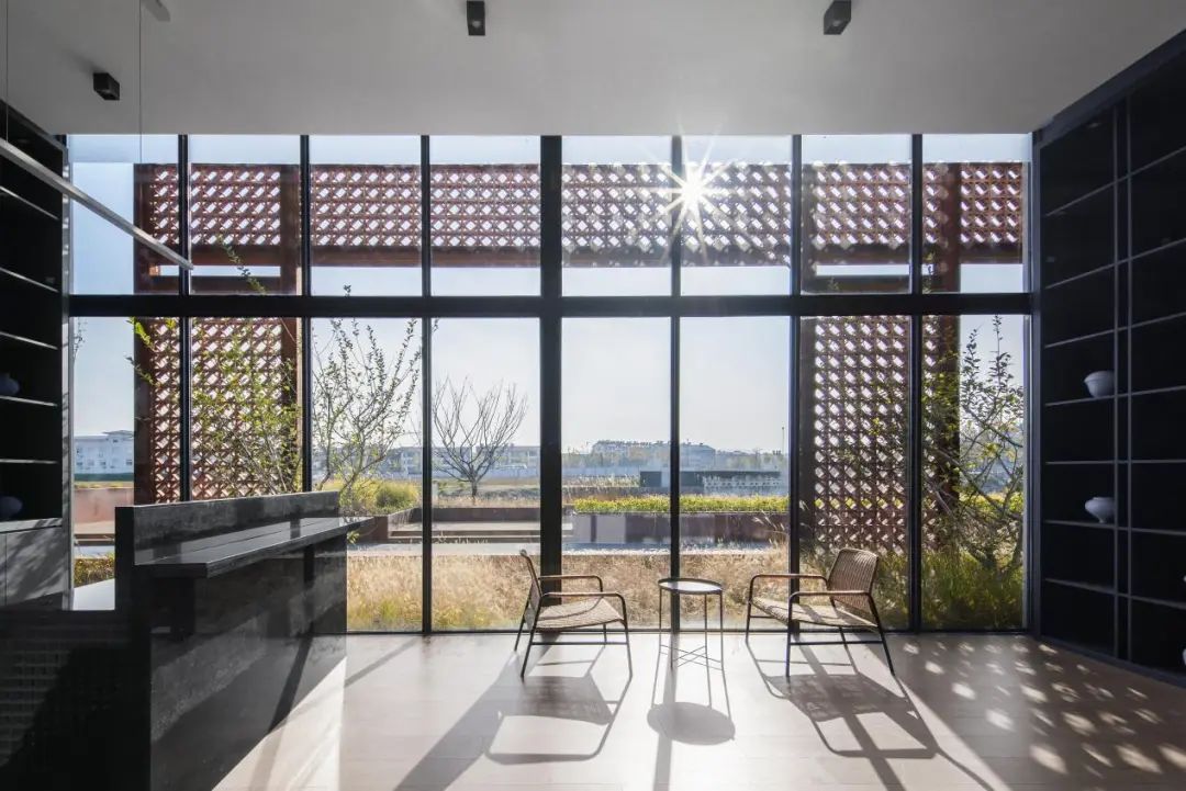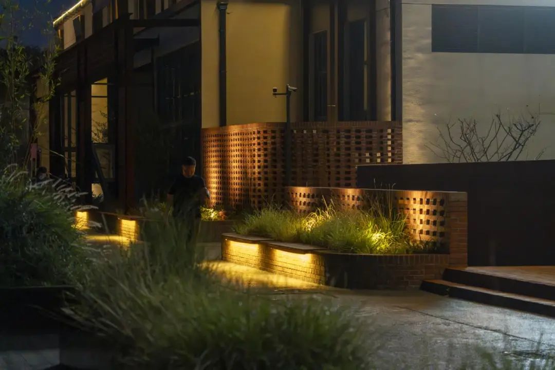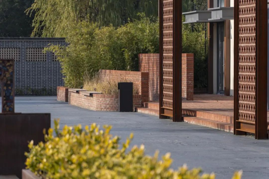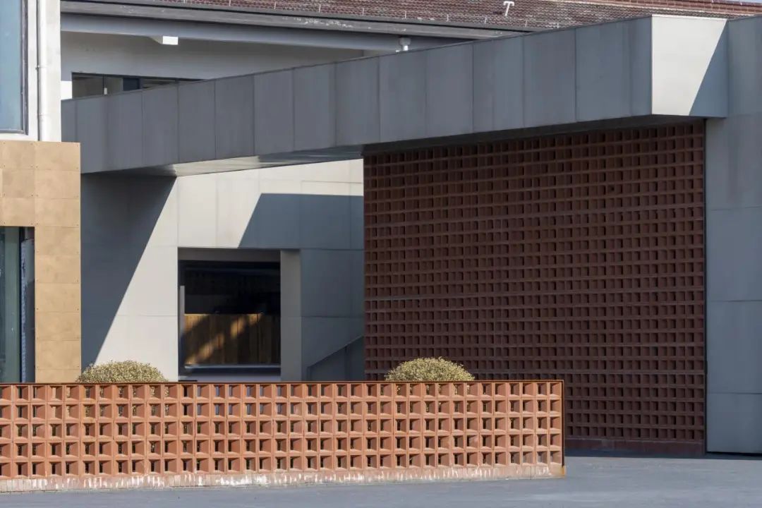 面对原有建筑立面单调的现状,创新性地采用工业遗存与本土材质相结合的解决策略:以工字钢梁构建结构性骨架,外置传统陶花砖幕墙系统,并精心配置多层次植被。这种复合式处理手法形成了虚实交织的立体韵律——钢构骨架勾勒出工业记忆的轮廓,陶砖幕墙以其特有的透光肌理与植被相互映衬,在阳光变幻中演绎出动态的光影交响,既实现了建筑与景观的有机对话,又通过材质语言的创新组合,在延续工业历史脉络的同时,塑造出富有生命力的内外过渡空间。