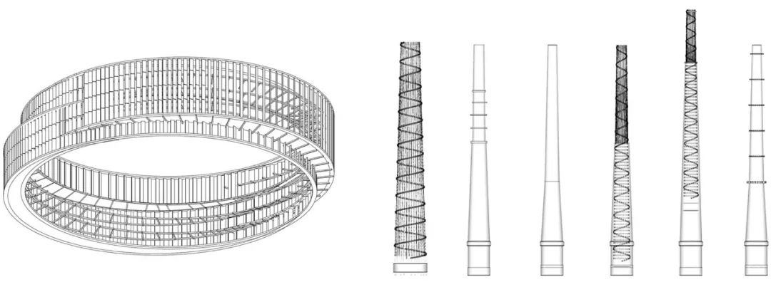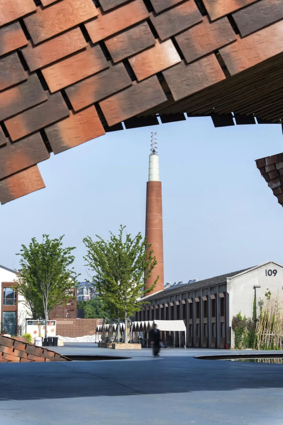 场地中央的老厂房烟囱保留并加高,改造为标志性艺术装置,通过分段材质隐喻"过去-现在-未来"的时间轴线,顶部以螺旋上升的"虚空之烟"造型形成视觉焦点,底部则保留陶砖材质连接地面,以放射状铺装限定空间,既扎根历史又象征向上精神。原陶书局原外立面采用水泥板铺贴缺乏表现力,设计拆除部分水泥板、替换镂空陶砖幕墙,强化了建筑形体的逻辑性与体块感,并将陶砖元素延伸至入口景墙、树池和地面铺装,形成统一的视觉系统。