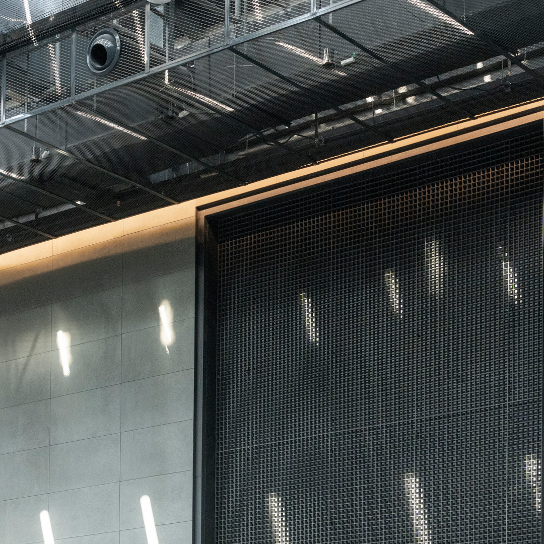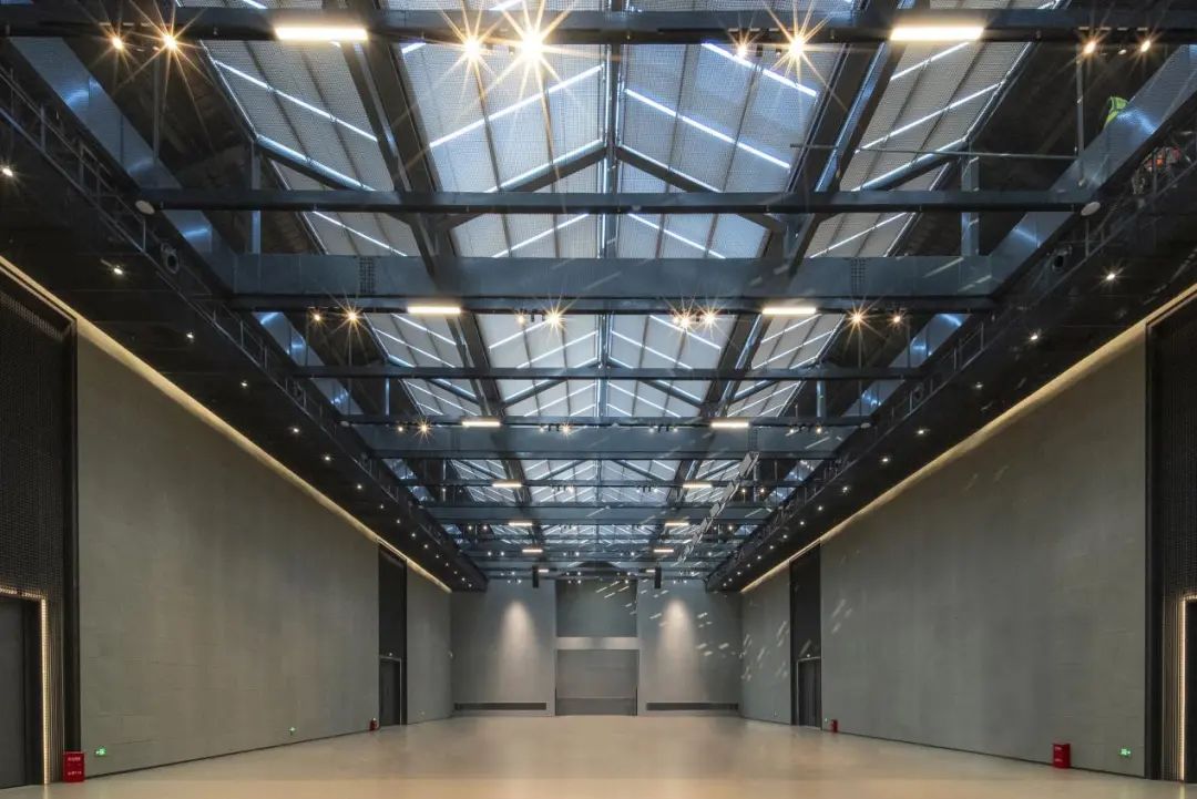 接待门厅通过蒋国兴陶艺作品的陈列,实现工业质感与艺术灵性的有机融合。透明玻璃体块的穿插运用,既划分空间功能,又提升整体通透感, 使工业、文化、艺术碰撞 。会展厅内强化保留工字钢、混凝土、金属方格等标志性工业材质。保留原始框架与钢结构屋顶,新增横向设备两边铺设,一体化整合,兼顾灯光系统与遮阳功能,实现技术与美学的平衡。