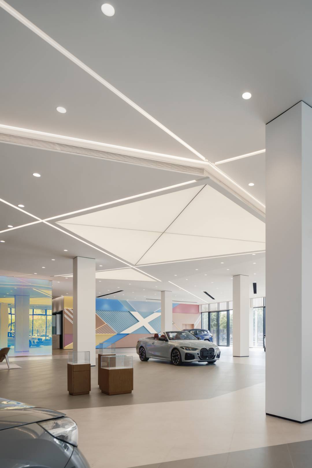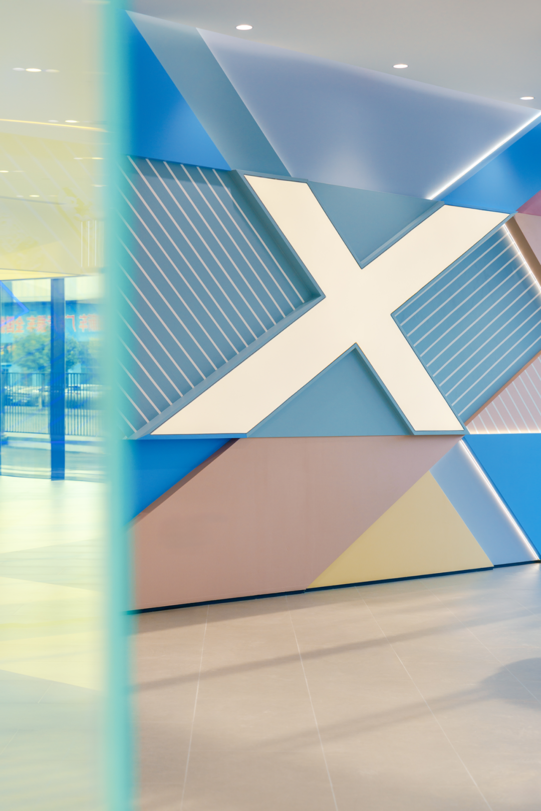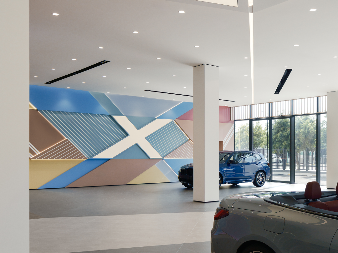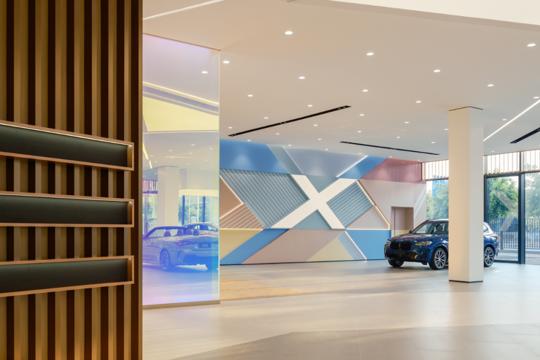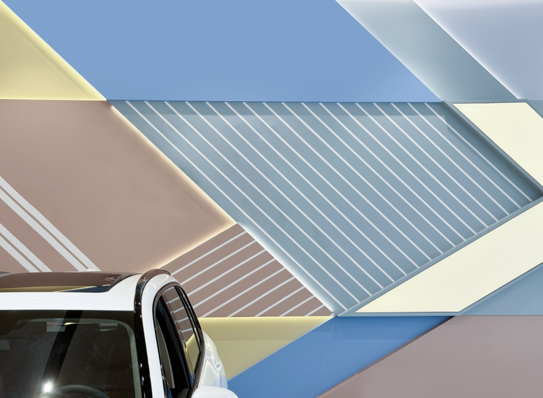端景板材以密缝工艺和色块切割,拼接形成X型立面,赋予蓝、粉、米黄等低饱和色彩,既活跃空间又不喧宾夺主,以一种生活向往的情绪氛围模糊“展示”与“体验”的边界。