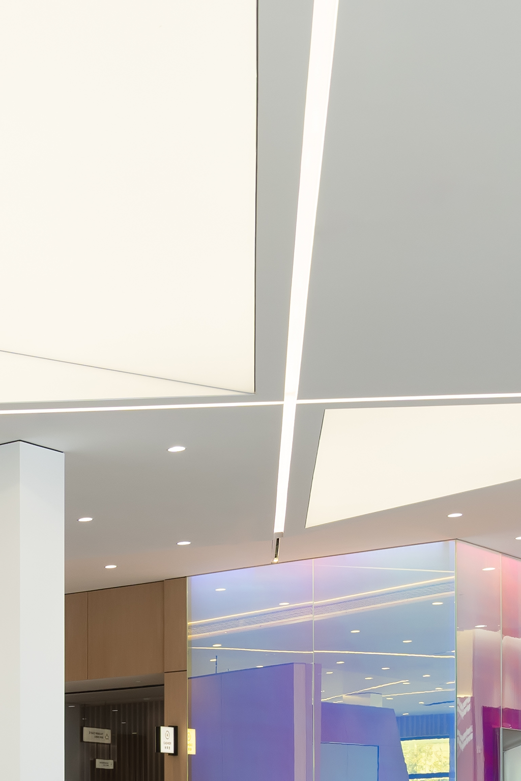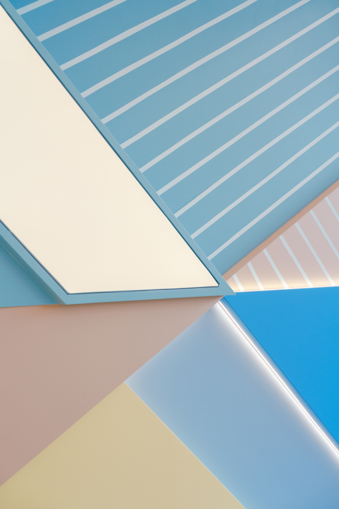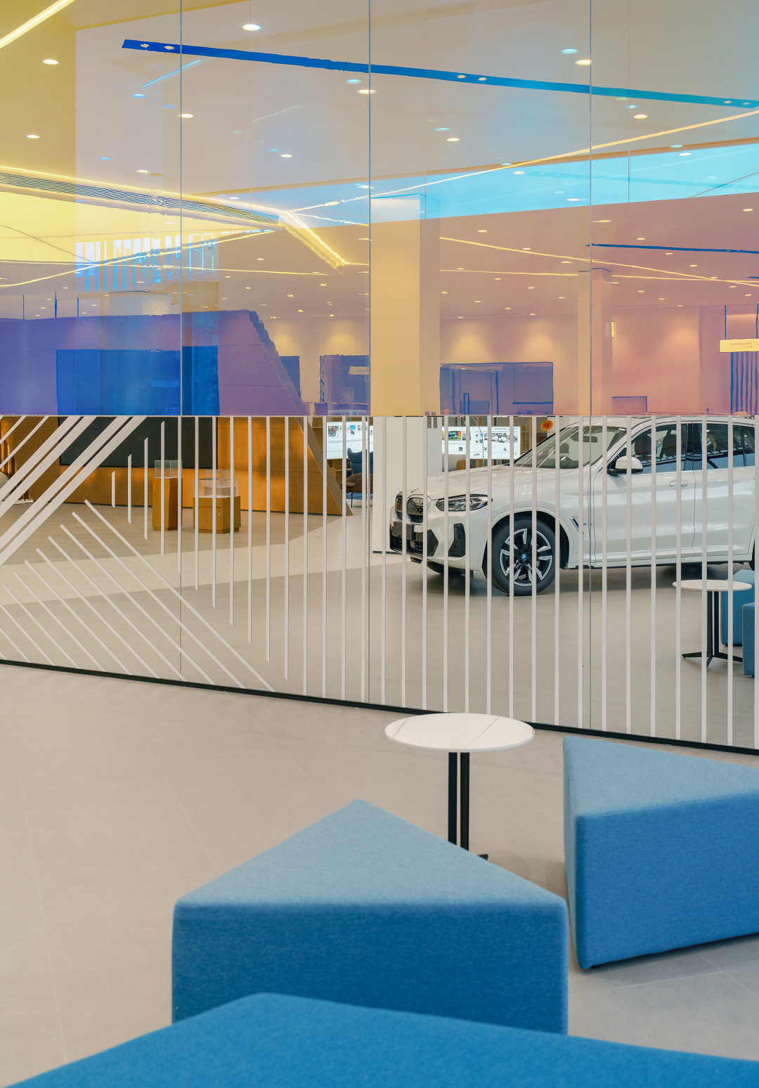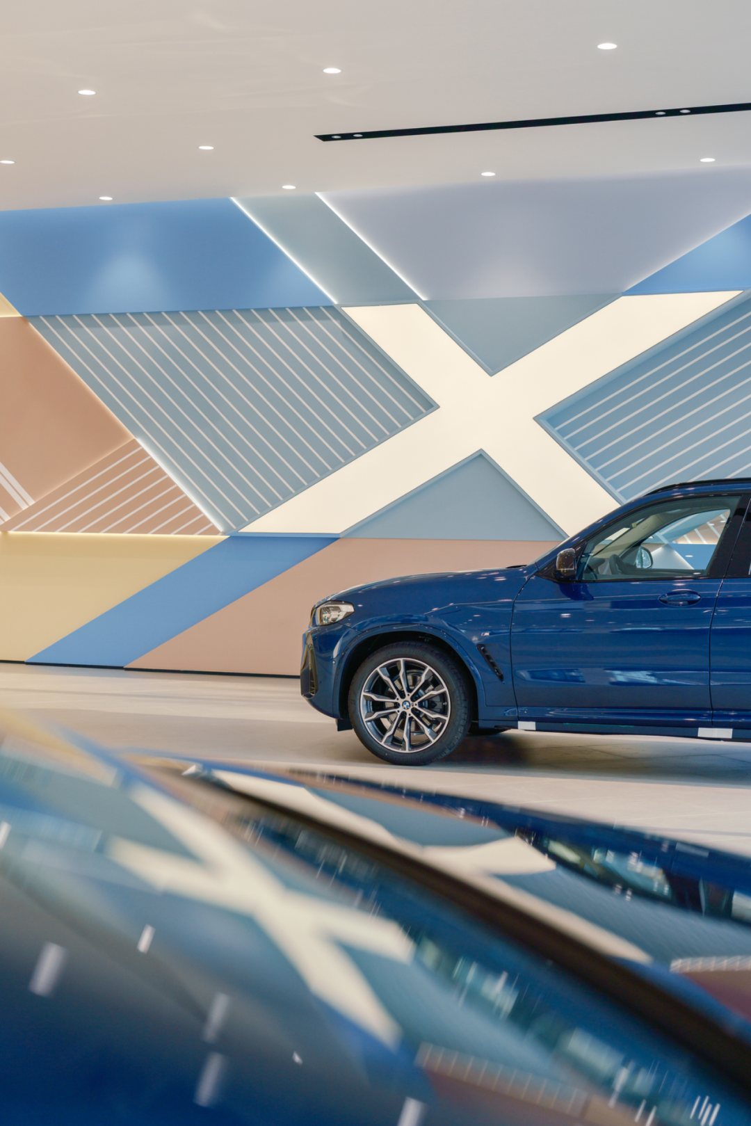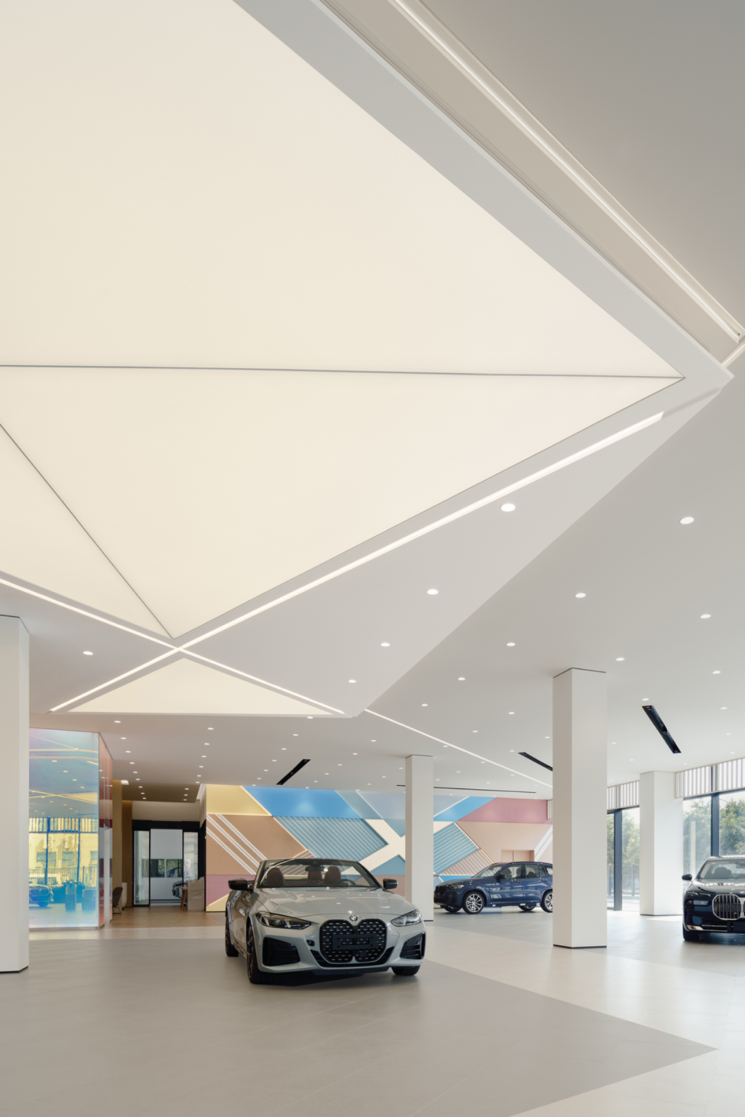 端景板材以密缝工艺和色块切割,拼接形成X型立面,赋予蓝、粉、米黄等低饱和色彩,既活跃空间又不喧宾夺主,以一种生活向往的情绪氛围模糊“展示”与“体验”的边界。