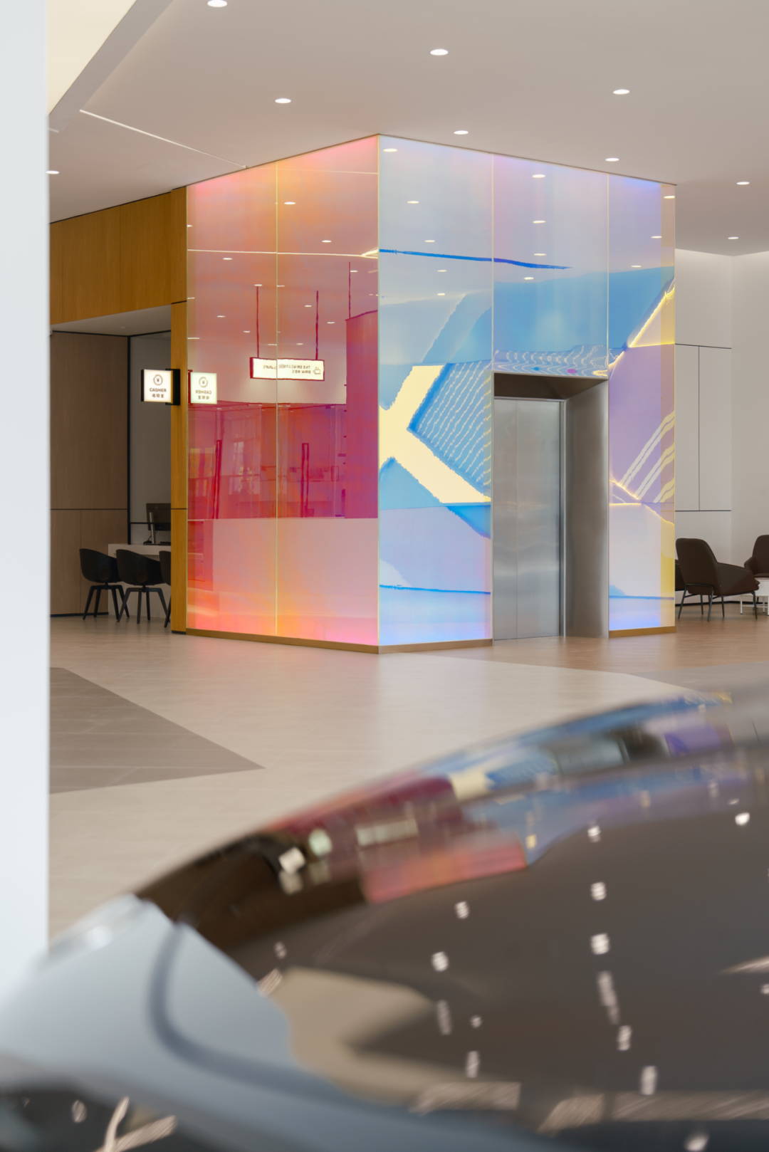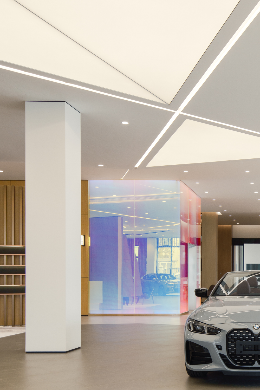 整体空间融合几何构成美学与自然材质调和,通过材料质感的对比(木的温润、金属的精致、幻彩玻璃的通透灵动、灰色瓷砖的沉稳)与色彩的配比,营造出更宽广的空间尺度,和更年轻化、更纯粹的新世代展车场景。