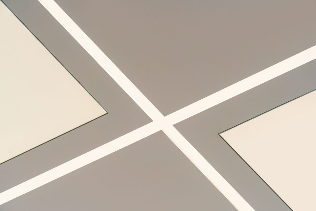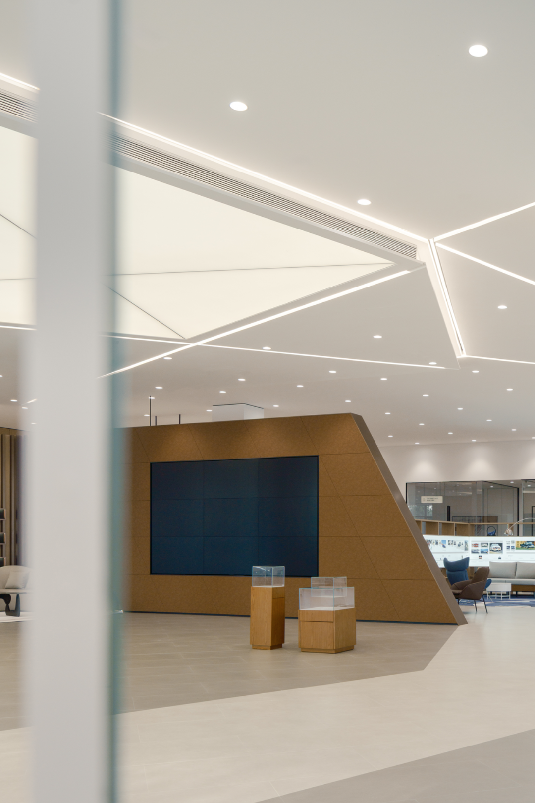 在立面上也同样用此纯粹简单的模块化单元,形成贯穿空间的线索,对应天花裂开X形几何光槽与地面的材质分缝,指引了人的行为轨迹,强化了空间的秩序感。立面隔断同时也是可拆卸的空间主板,以预制构件为核心组件,实现空间灵活分隔,减少视觉遮挡,强化展品主体地位,亦适应未来随新品、活动节点演变的活态场景。