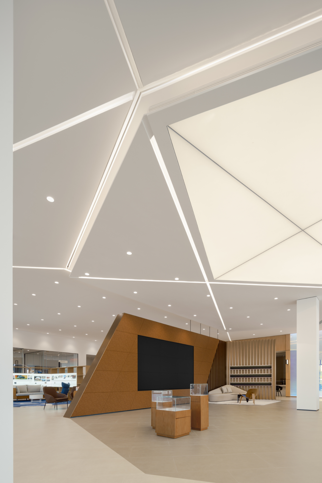 为了满足客户体验中的视觉层次和心理期待,设计团队希望在平面布局上打破传统方正空间格局和呆板的平面感,强化空间的「纵深感」和「可达性」,因此在平面上同样以“X”型多面体切割视觉符号拉长动线,通过几何棱面的交错组合,构建出具有数学规律的立体空间形态。