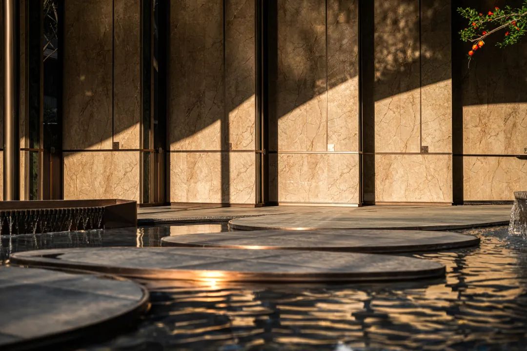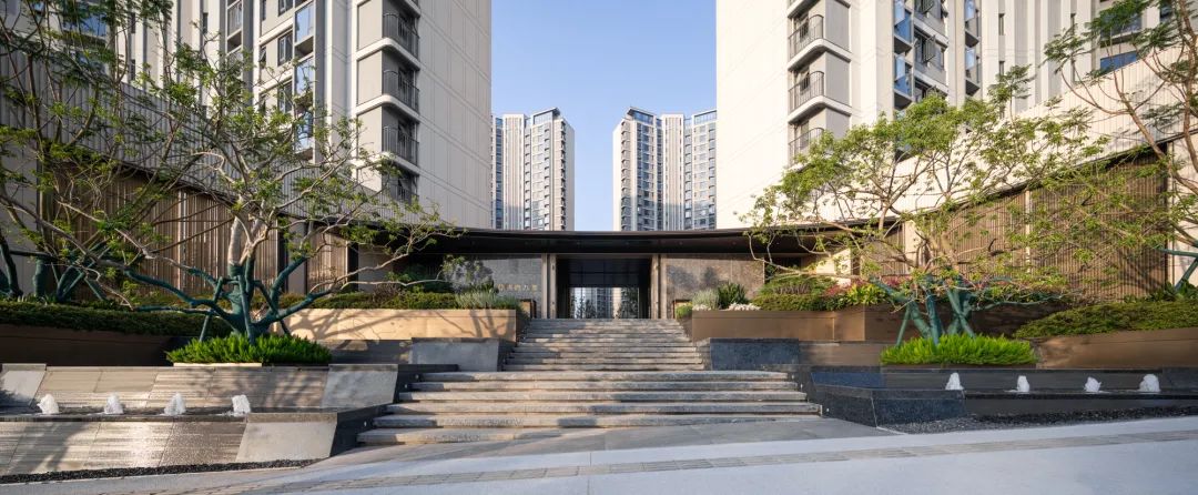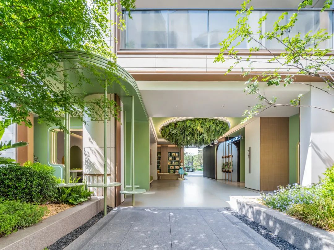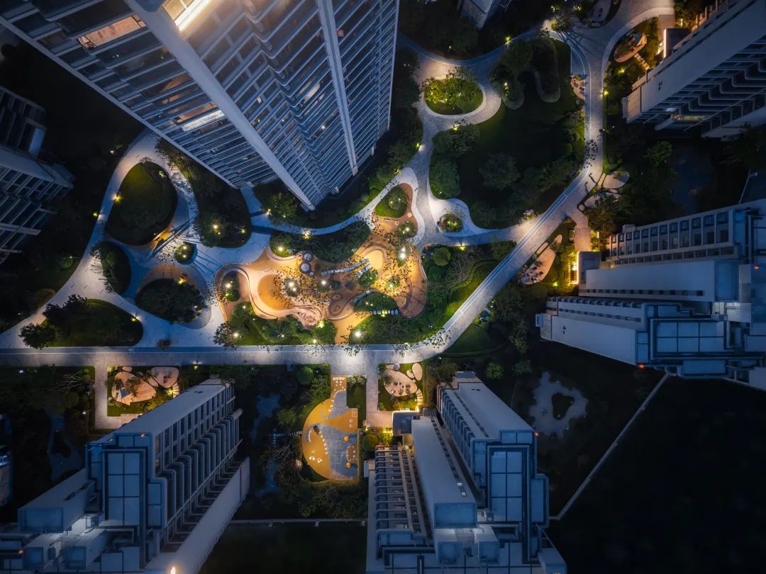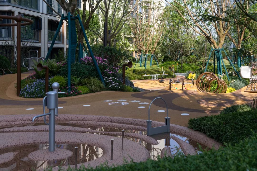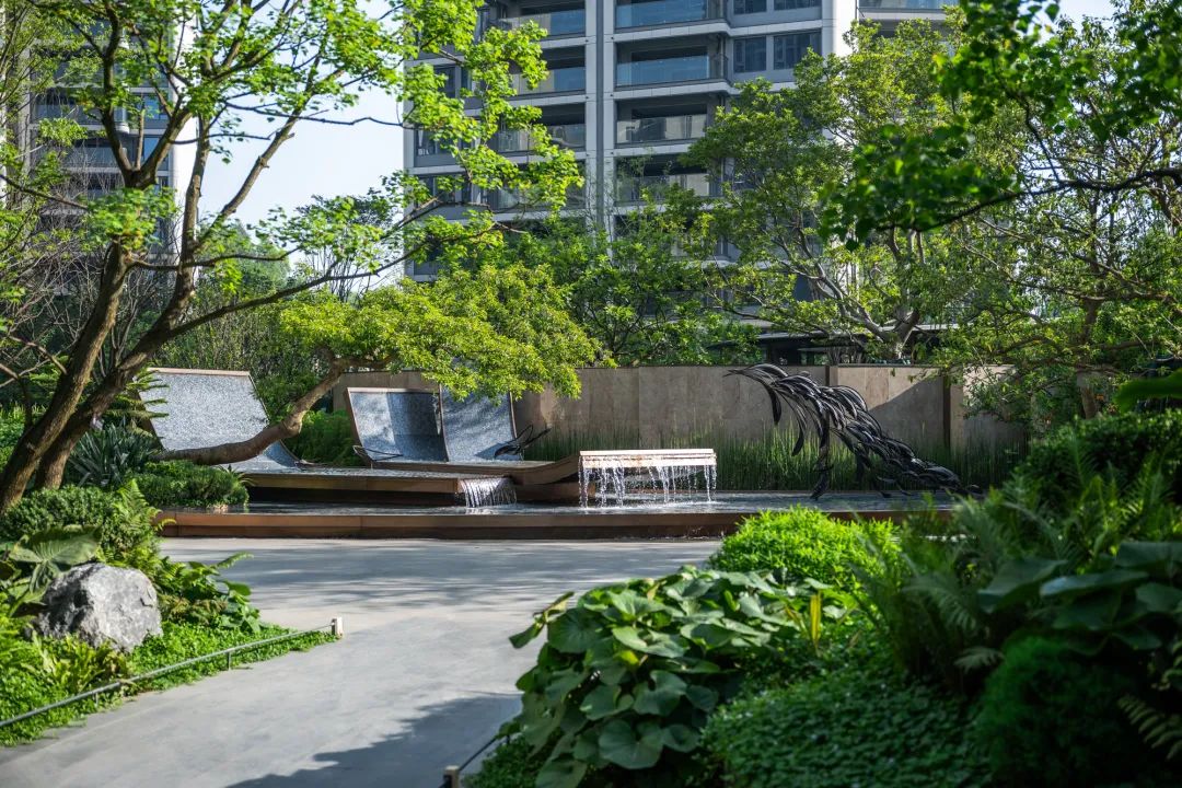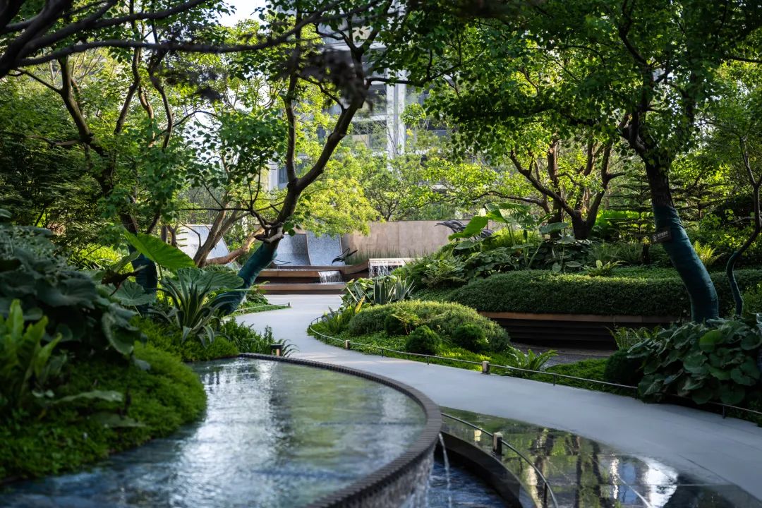 依托19米天然高差与315米超尺度中庭,天府九里构建了一座“立体公园社区”。景观不仅是对巴蜀山水风貌的当代转译,更通过多元场景激活、全龄功能植入及四季植物叙事,重新定义了公园城市的居住范式。