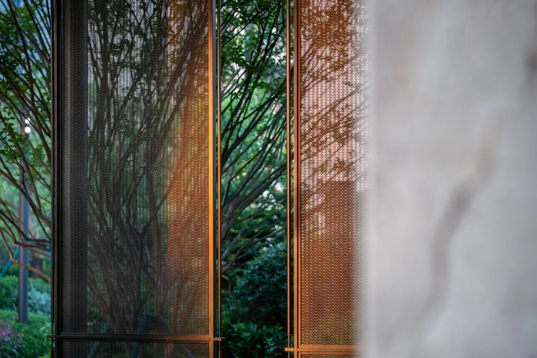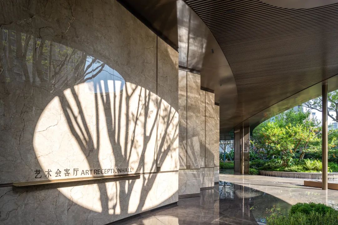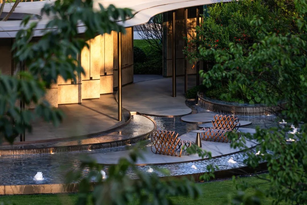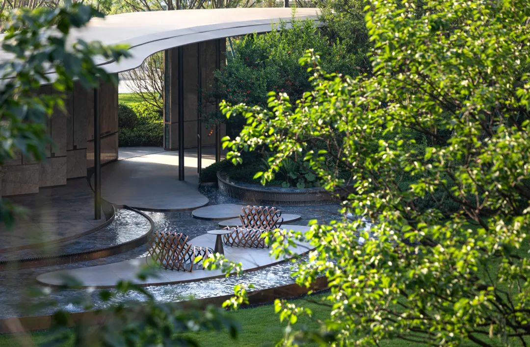 寻着瀑布水流声,一座叠水之上的艺术长廊客厅位于视觉中央。廊架立面由精致的金属帘包裹,整个廊架被自然包绕,具有良好的视线通廊,两侧分别临大草坪和水岛,宽阔的水面中绿岛交融,蜿蜒的岸线将视线引领延伸。