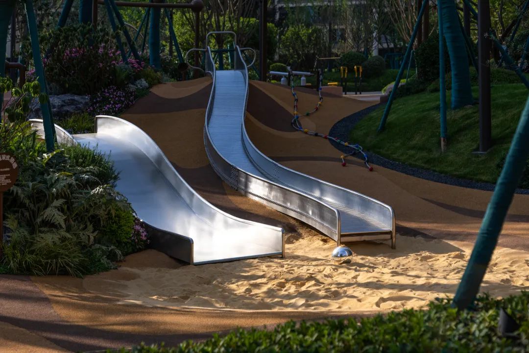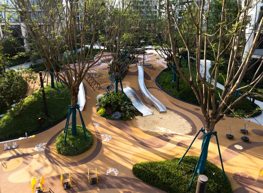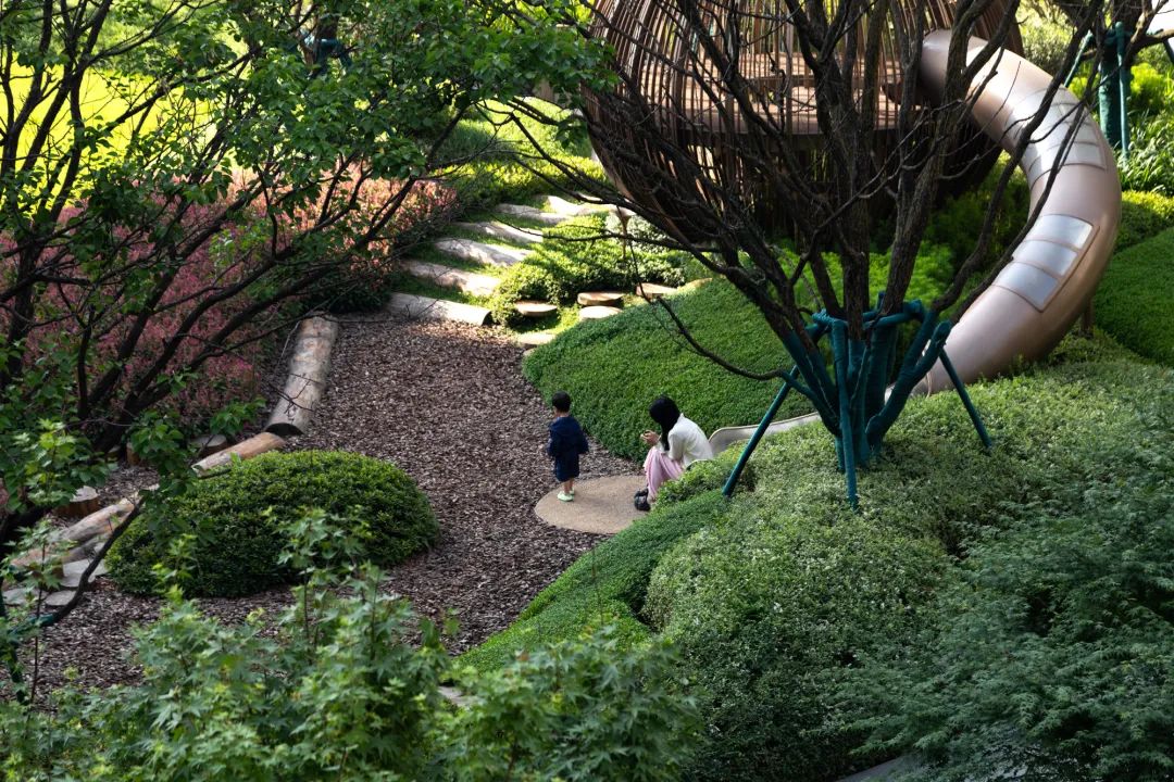 南侧小中庭将空间集中在人的动态需求上,500米跑道与1公里漫步道串联起各类运动场地,满足全龄段活力需求。儿童主题乐园以“小象宝宝追寻记”的故事线索,把对自然的认知、探索与玩乐植入到空间,地形高差也为孩子们提供了天然的游戏攀爬乐园。