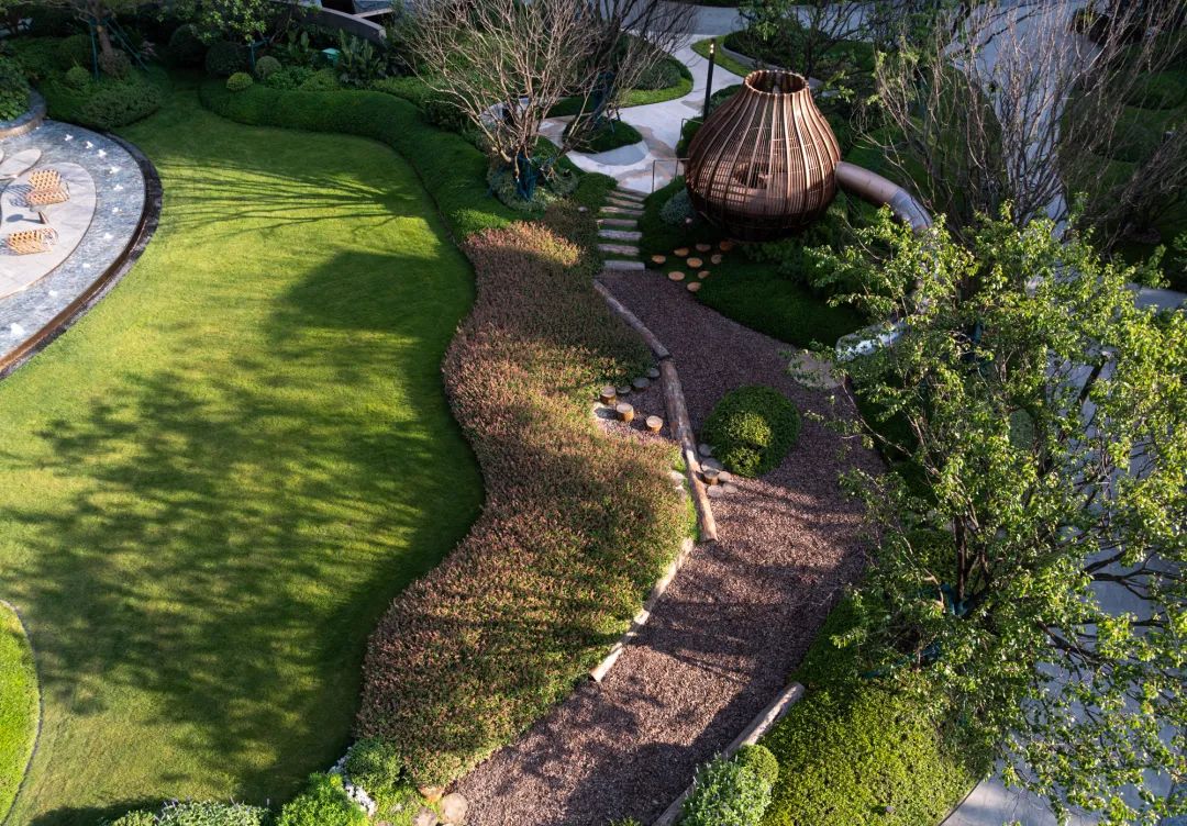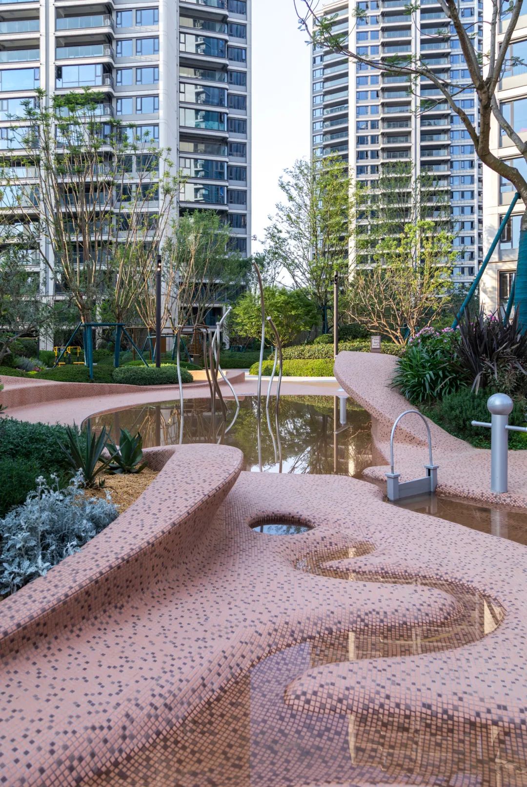 以廊架为大中庭中心,景观宛如画卷般展开,丰富的高差条件实现场景多元化立体公园社区,从西侧最高处向东,空间开合有度,随着地形的攀升,一路从流淌的绿溪、悬空的林梢栈道、起伏的大地艺术乐园、蜿蜒的九曲花街,形成意趣盎然的立体艺境,也为居住者创造出更多的空间体验。