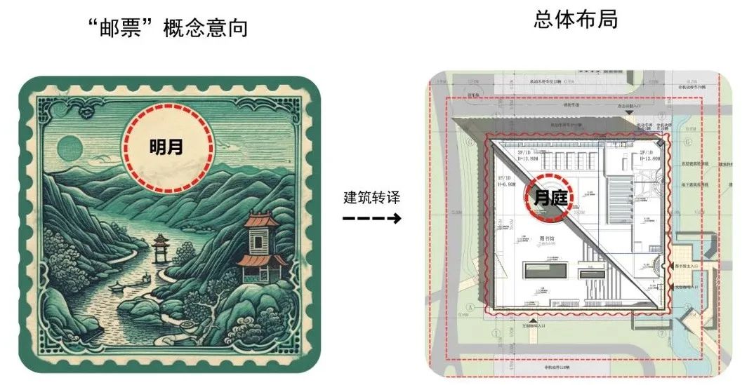 基地呈方形,所以布局用方形体量将之充满,二层面向景观面(未来市政广场及兰祺河景观)45度斜切,形成体量与自然环境的自然过渡;一层对角切开形成开放的室外公共步道,将屋顶作为公共空间与公园景观融为一体;内部因采光通风需要,通过将圆形,方形,三角形通过布尔运算构造实体几何,使得形态进一步丰富,且在平面形态上关联诗人余光中的乡愁邮票的平面形状与边界,立面形态上因月庭空间的存在,继而关联“海上升明月,天涯共此时”两岸亲人彼此思念的场景意境。