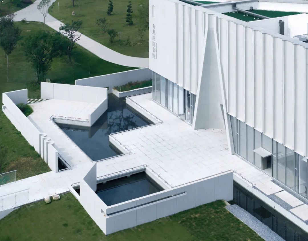 空间序列是场所营造的主线索。场域的体验从跨越一弯浅水的的廊桥开始,对应三角锥形的主入口建立进入的仪式感,跨越廊桥进入一方安静水院,1.5米高的围墙恰到好处的控制人的水平视线高度,屏蔽外部喧闹的城市空间的同时,在墙体围合的尺度上建立起与人体尺度的关联,衔接起内部空间。