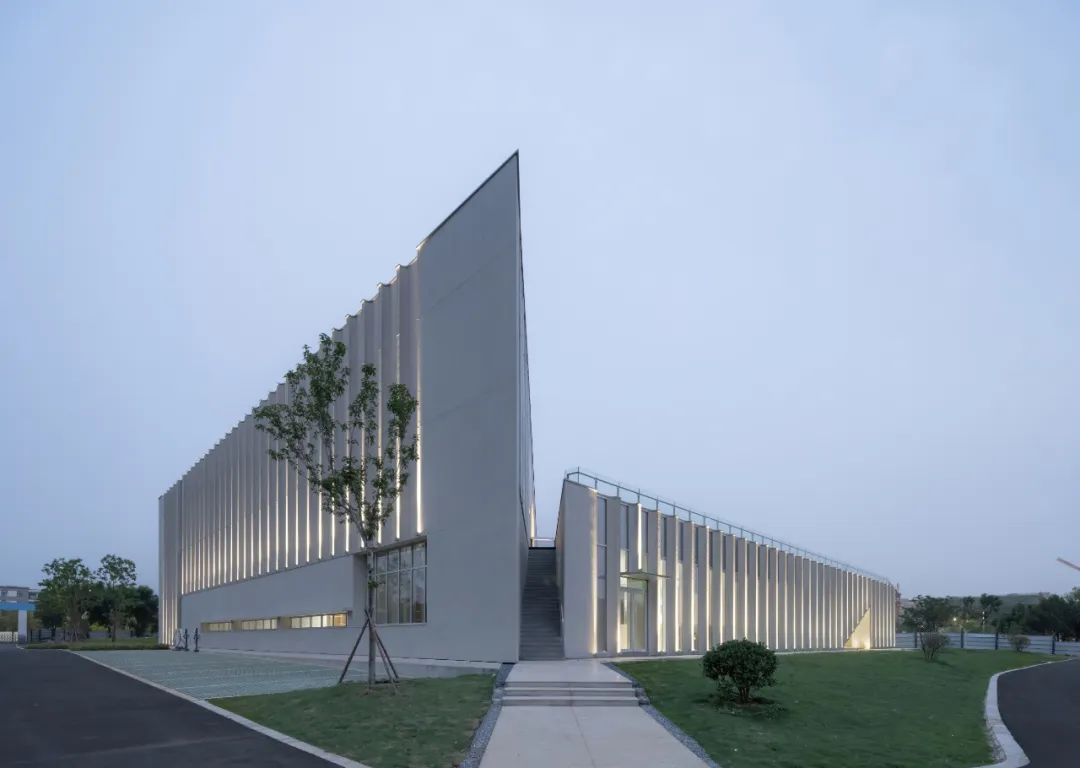 材料建构为了营造纯净的内部空间,采用清水混凝土材料浇筑成型,结构建筑机电一体化整合处理,将设备管线置于地面架空层,方便维修调试。现浇装饰混凝土的建造工艺使建筑的空间获得了连续统一的整体性,自然的肌理使空间显得更加生动自然。没有多余的装饰,混凝土透露出的天然、质朴的气质与自然环境浑然一体,实现了空间与形式内外一致、表里如一。外观UHPC采用邮票锯齿状的形状,内部整合通风开启及亮化照明装置。